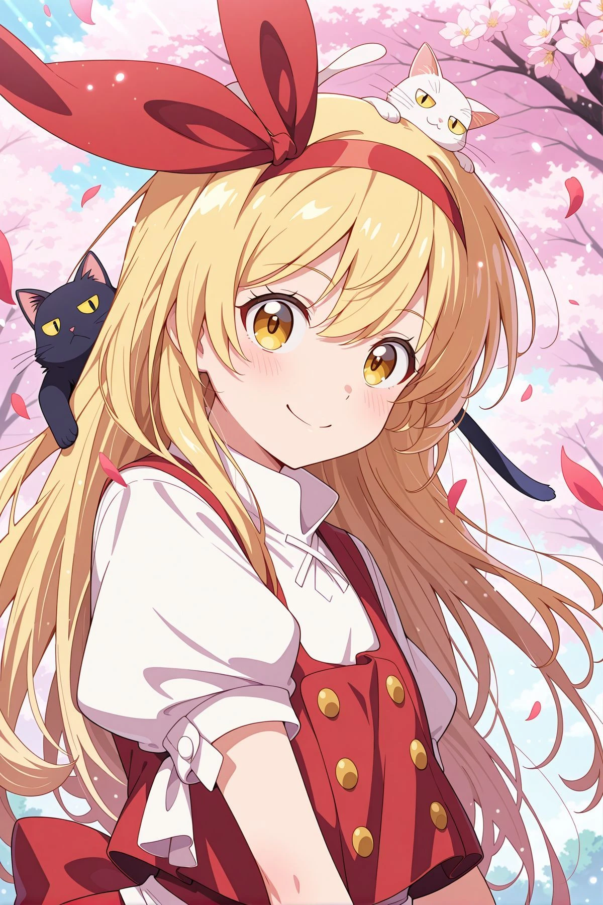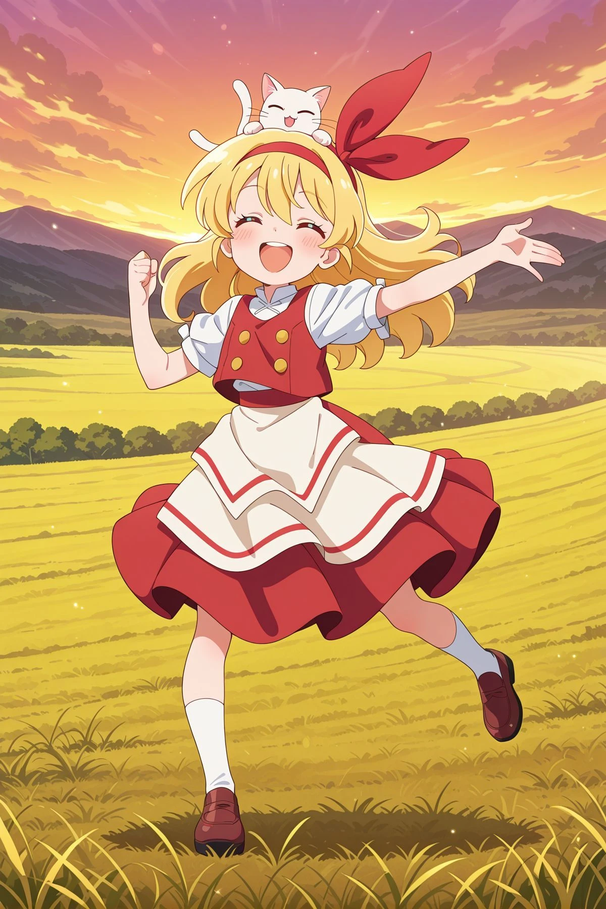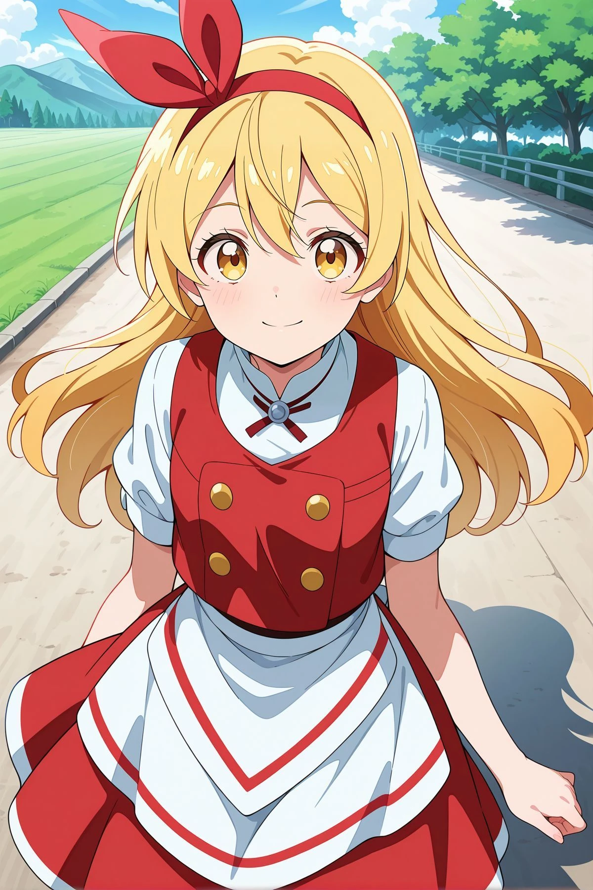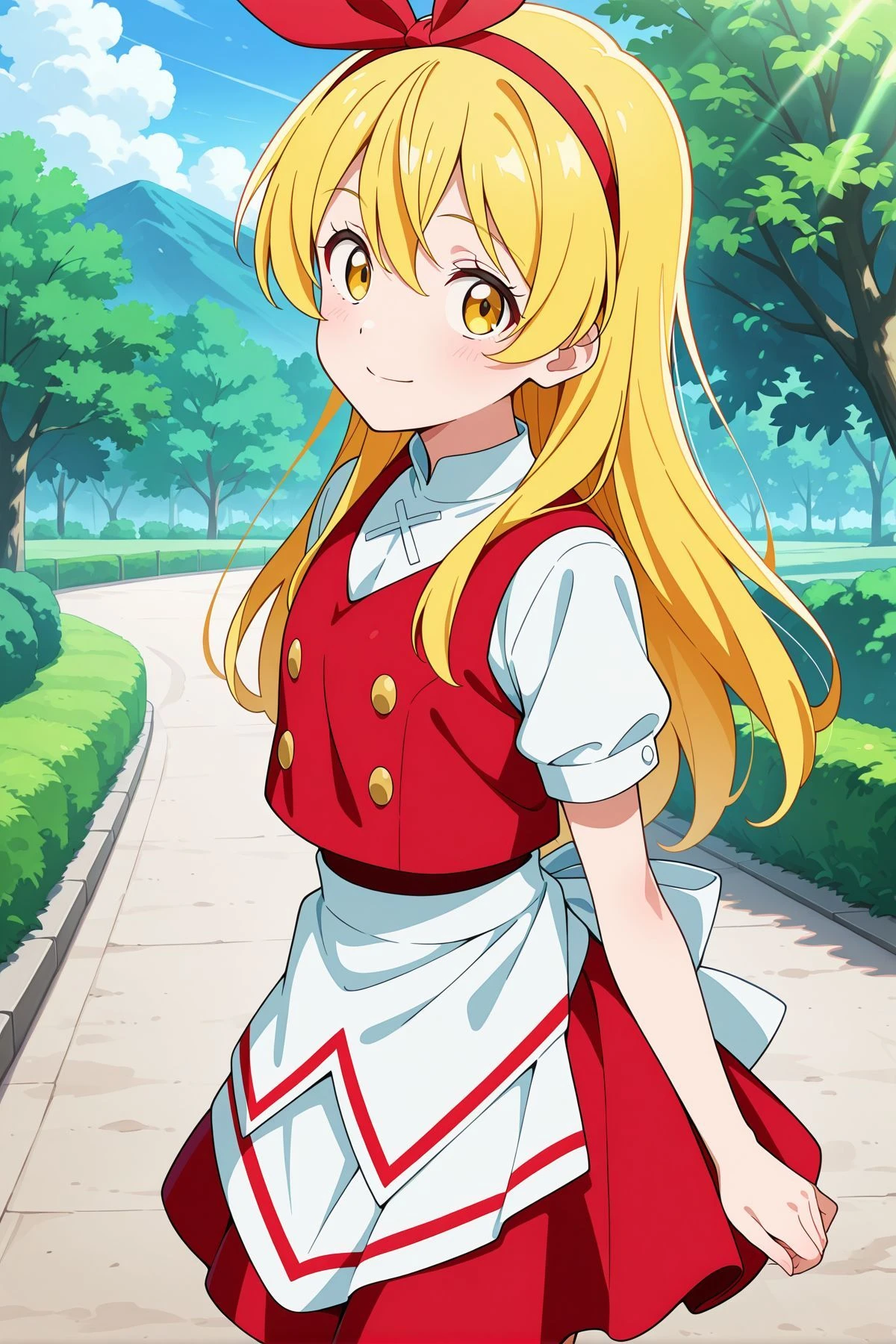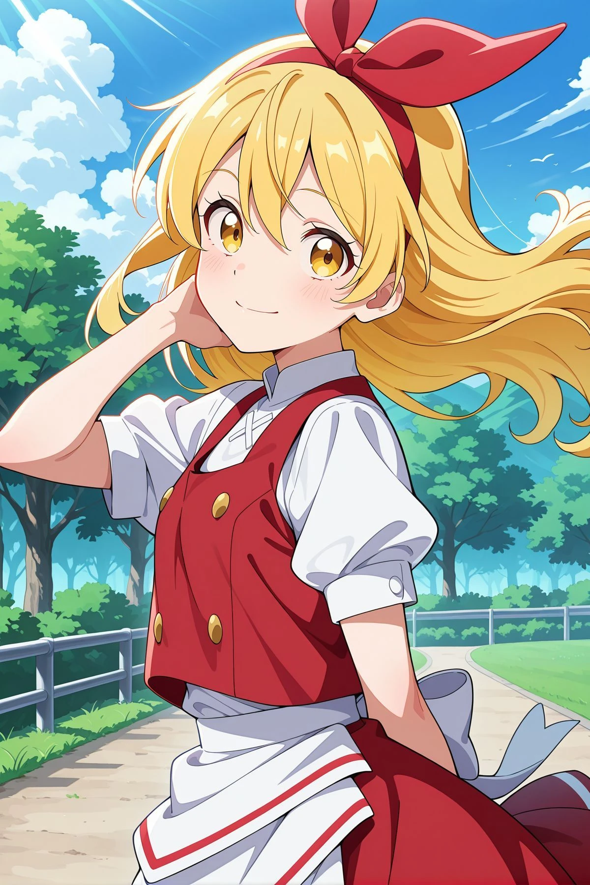 ellen, 1girl, solo, yellow eyes, blonde hair, long hair, hair ribbon, red ribbon, red hairband, red vest, buttons, white shirt, short sleeves, red skirt, white aporn, waist apron, Alternatives :