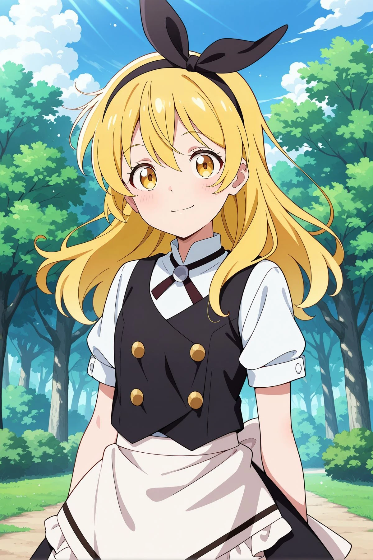 ellen, 1girl, solo, yellow eyes, blonde hair, long hair, hair ribbon, black ribbon, black hairband, black vest, buttons, white shirt, short sleeves, black skirt, white aporn, waist apron, None from Touhou LostWord