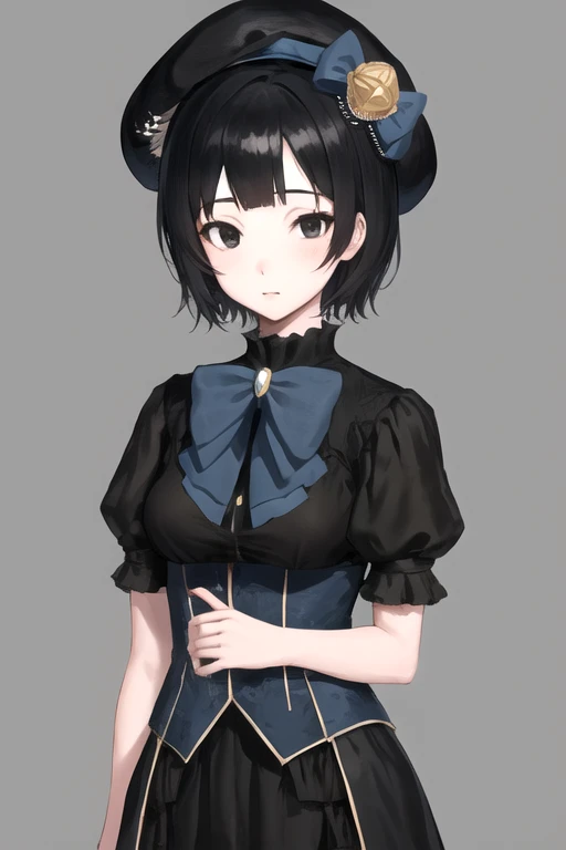KaoruHazuki, 1girl, solo, short hair, black skirt, black hair, hair ornament, black dress, jewelry, short sleeves, frills, bowtie, black eyes, black headwear