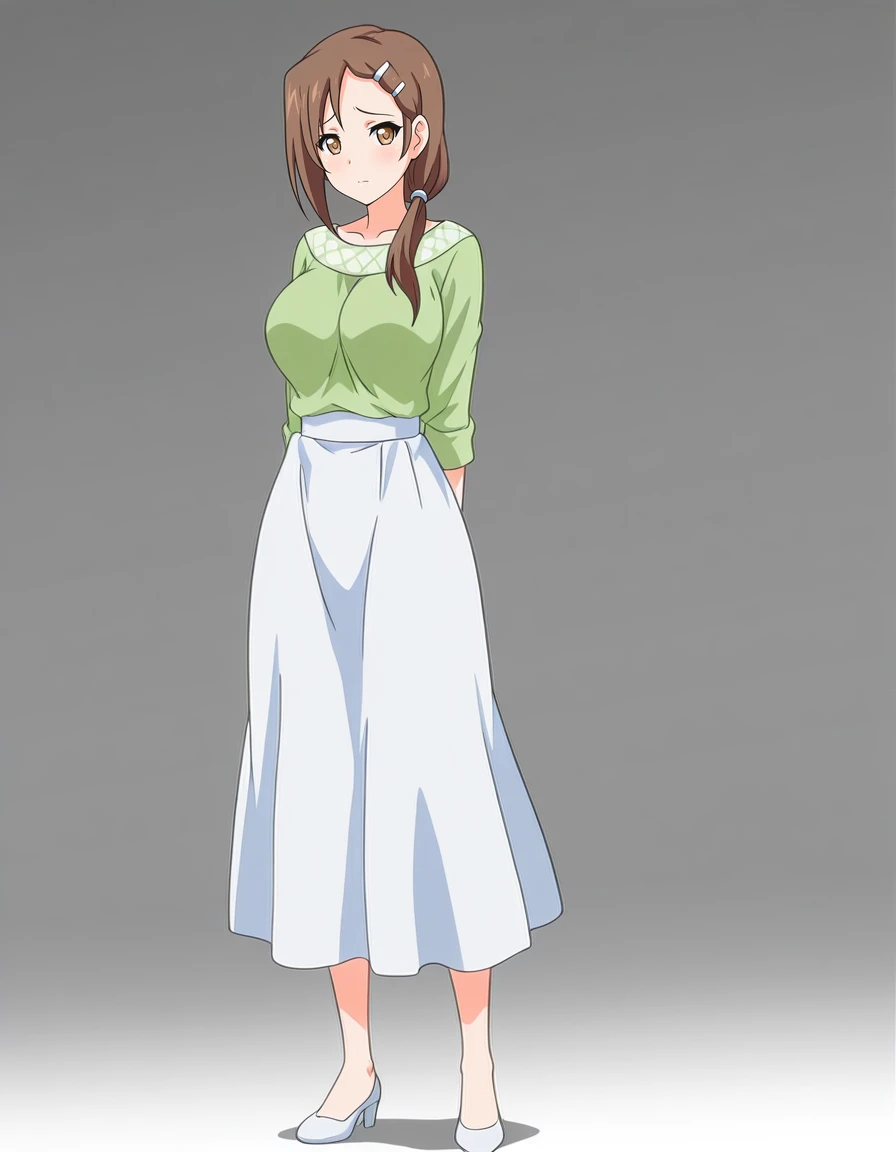 mai_wsss,mai_shioriws,long_hair,ponytail,brown_hair,brown_eyes,large_breasts,hair_over_shoulder,hairclip,green_shirt,long_skirt,white_skirt