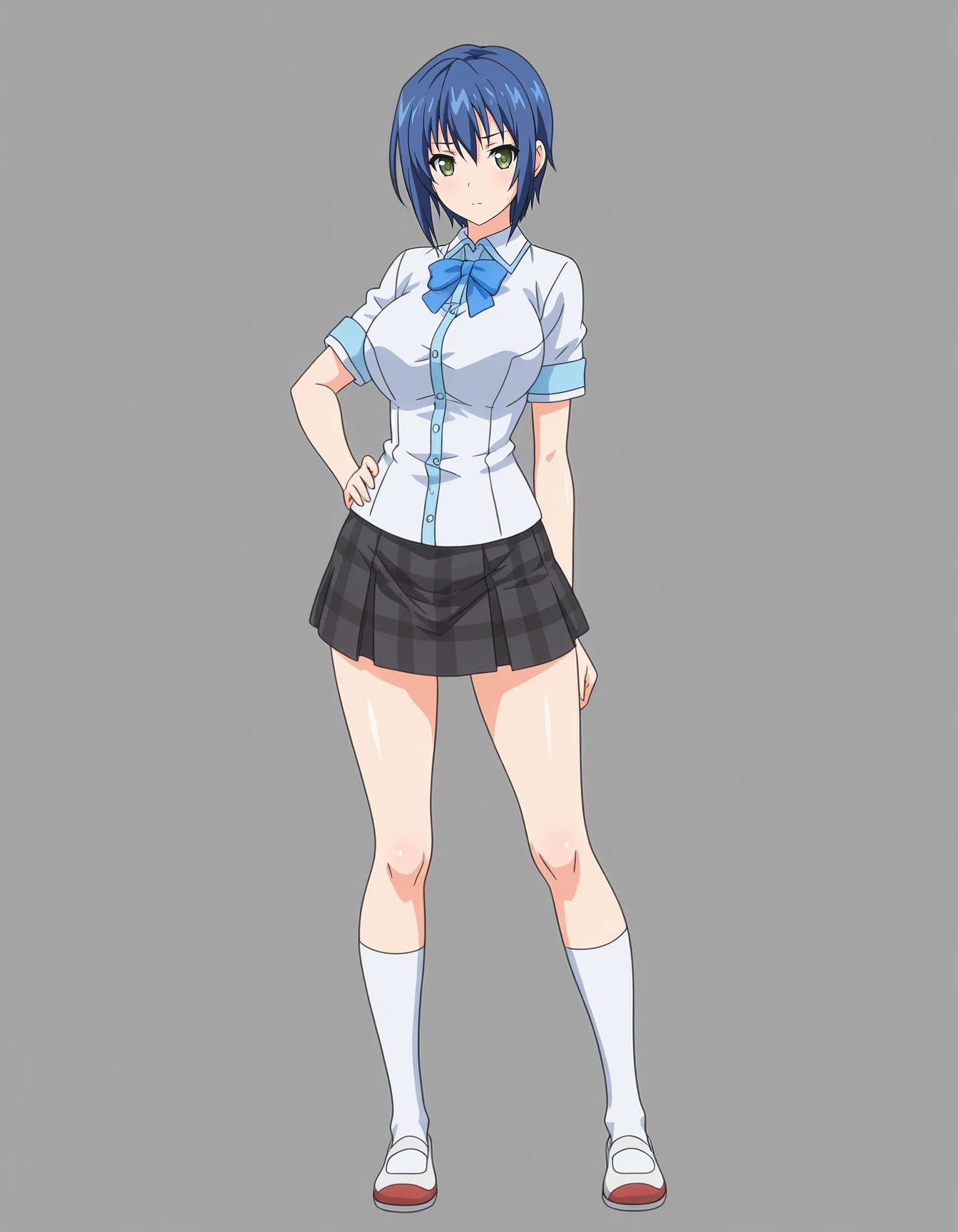 mai_wsss,mai_yoshiyukiws,short_hair,sidelocks,blue_hair,green_eyes,large_breasts,bow,school_uniform,plaid_skirt