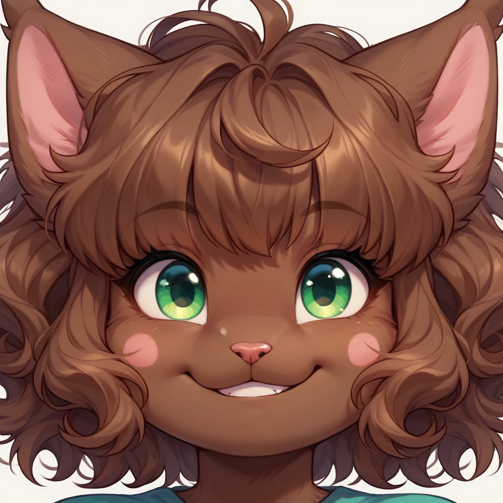 Darcie, anthro, brown fur, brown body, hair, pink cheeks, green eyes