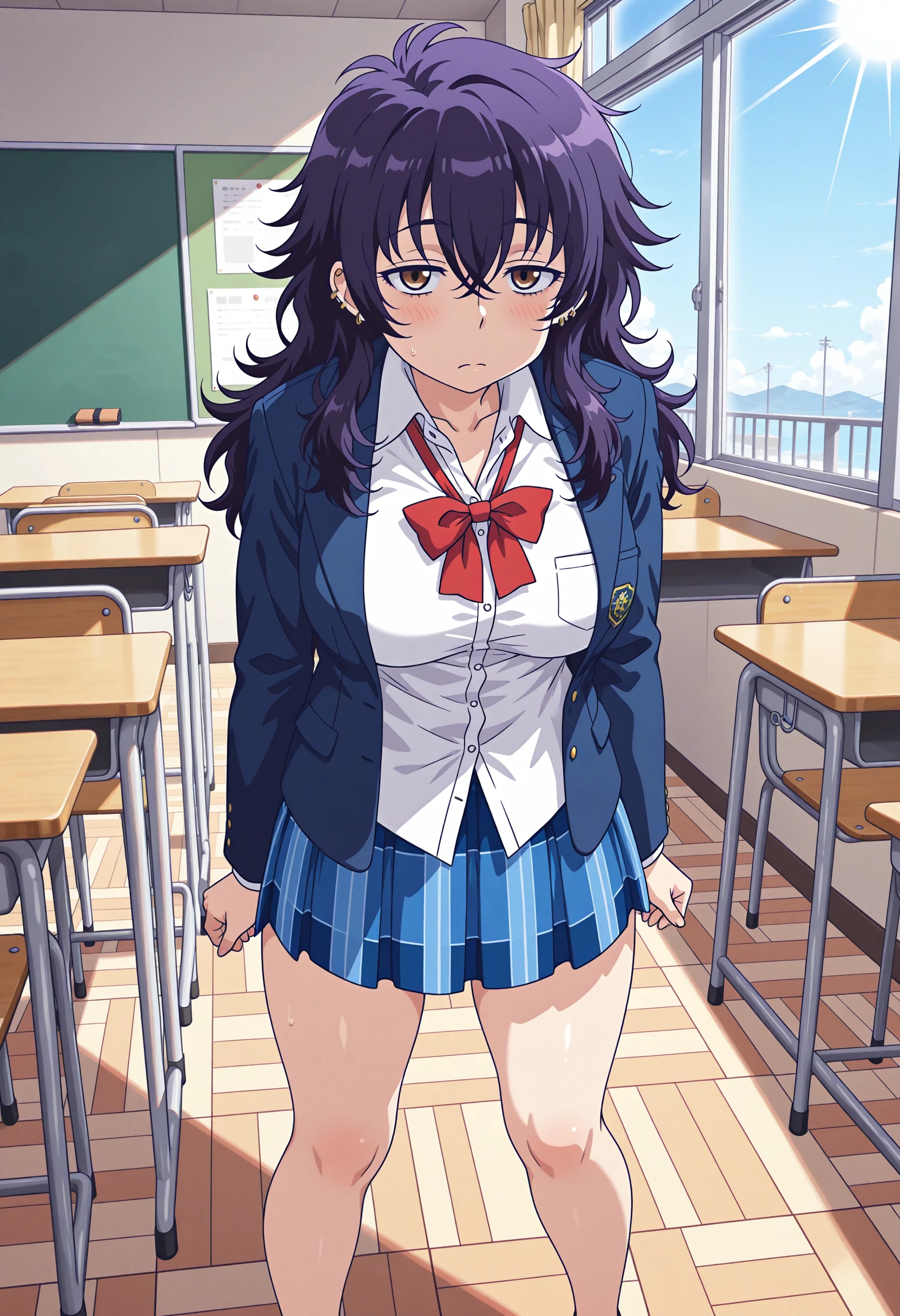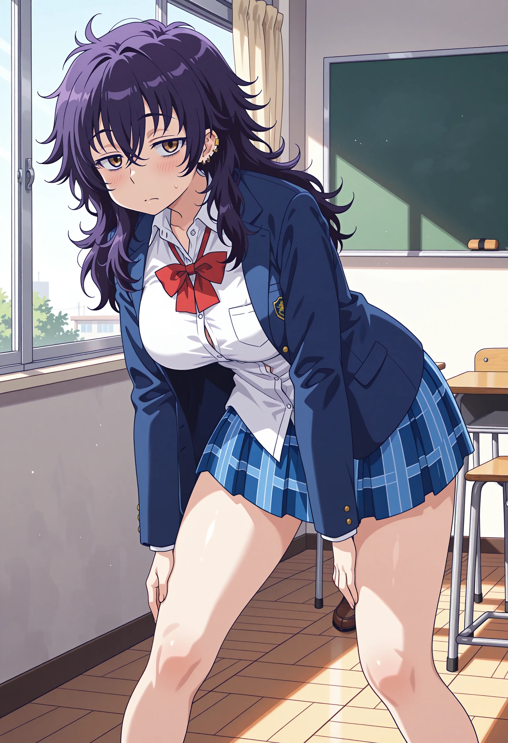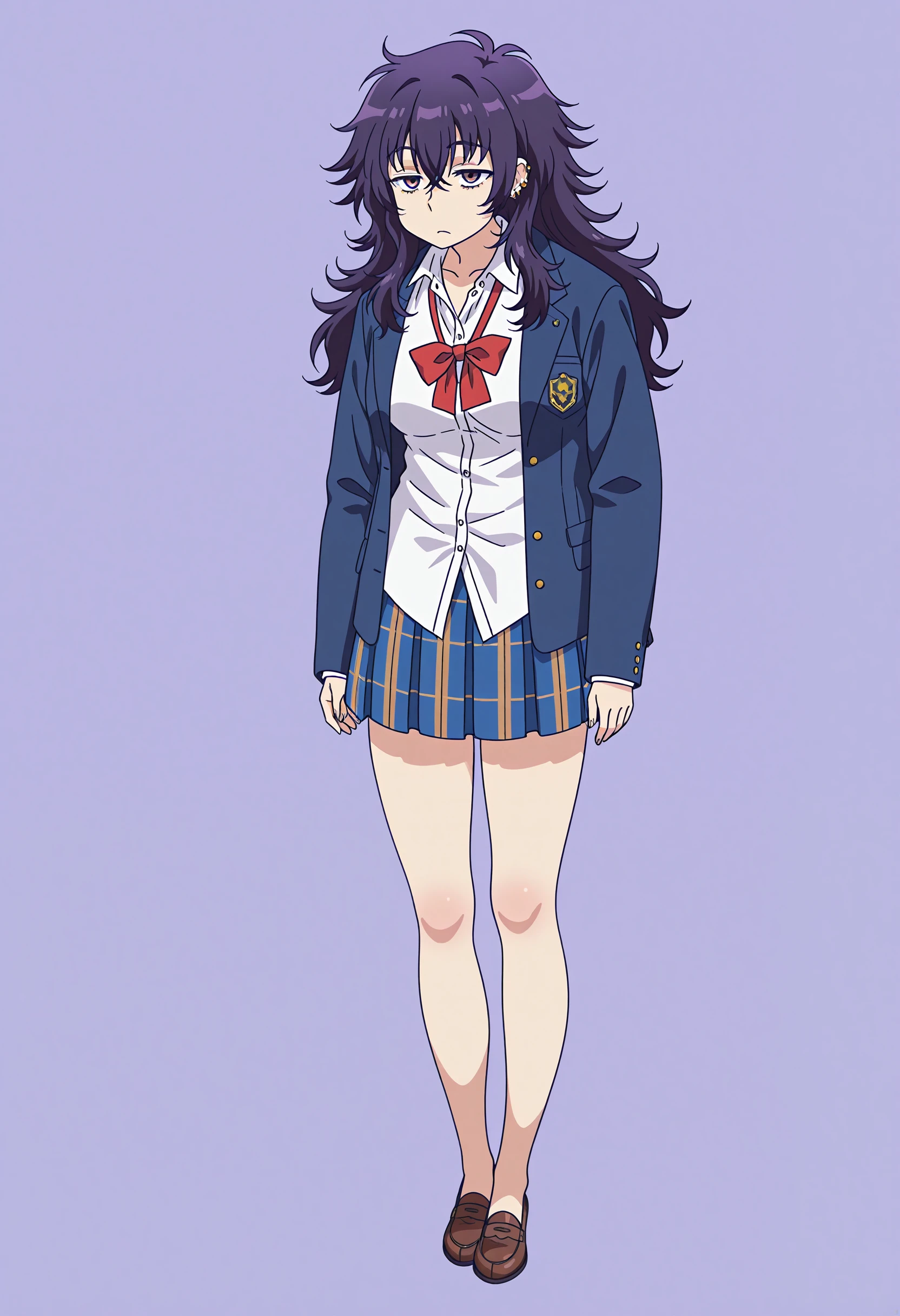 1girl, collared shirt, bags under eyes, blue jacket, necktie, bangs, purple hair, piercing, long hair, plaid skirt, ear piercing, red bowtie, untucked shirt, brown loafer, no socks , open jacket, bare legs, semi-big breast, brown eyes.