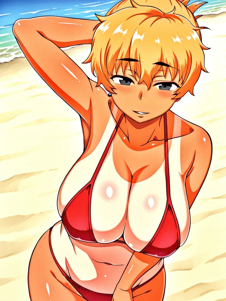 akina tk, folded ponytail, earrings, one-piece tan, mature female, blonde hair,