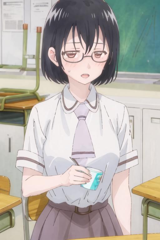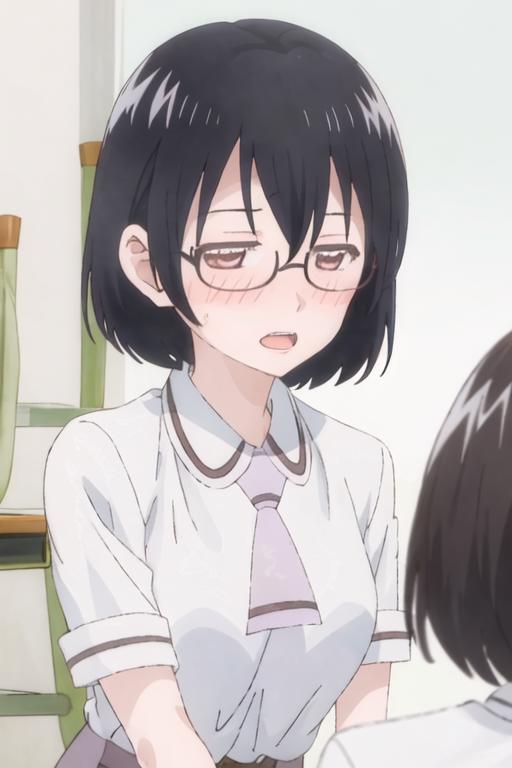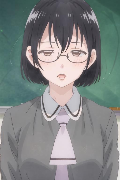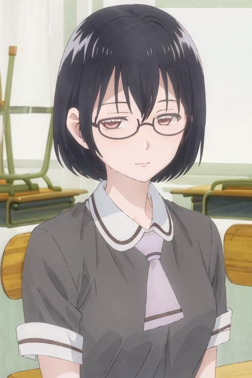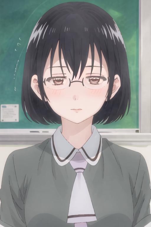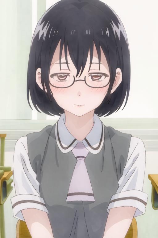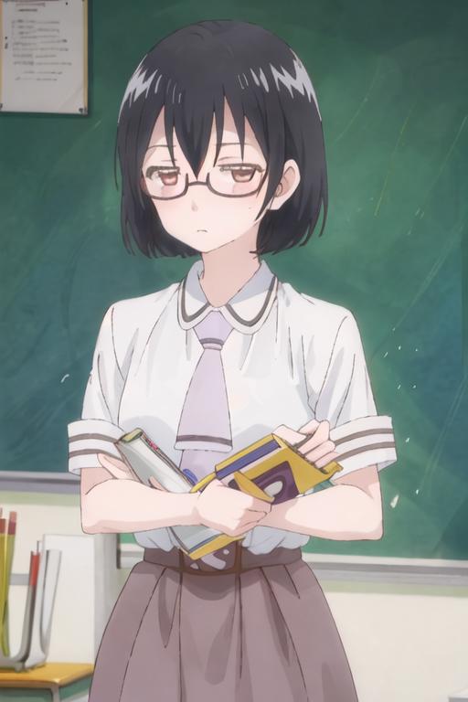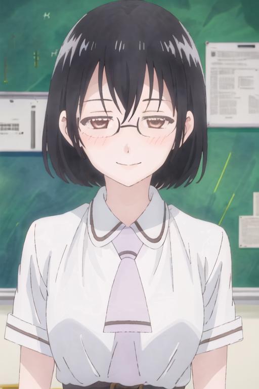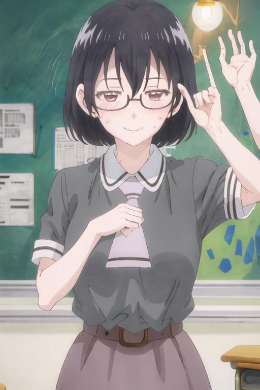 The trigger word is kasumi_nomura_asobiasobase, and the recommended tags are best quality, masterpiece, highres, solo, {kasumi_nomura_asobiasobase:1.15}, black_hair, glasses, short_hair, necktie, brown_eyes.