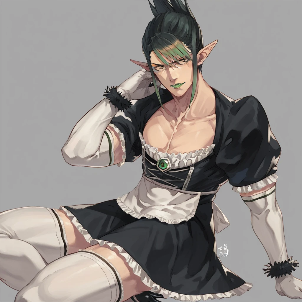 black hair, green hair, multicolored hair, yellow eyes, pointy ears, green lips