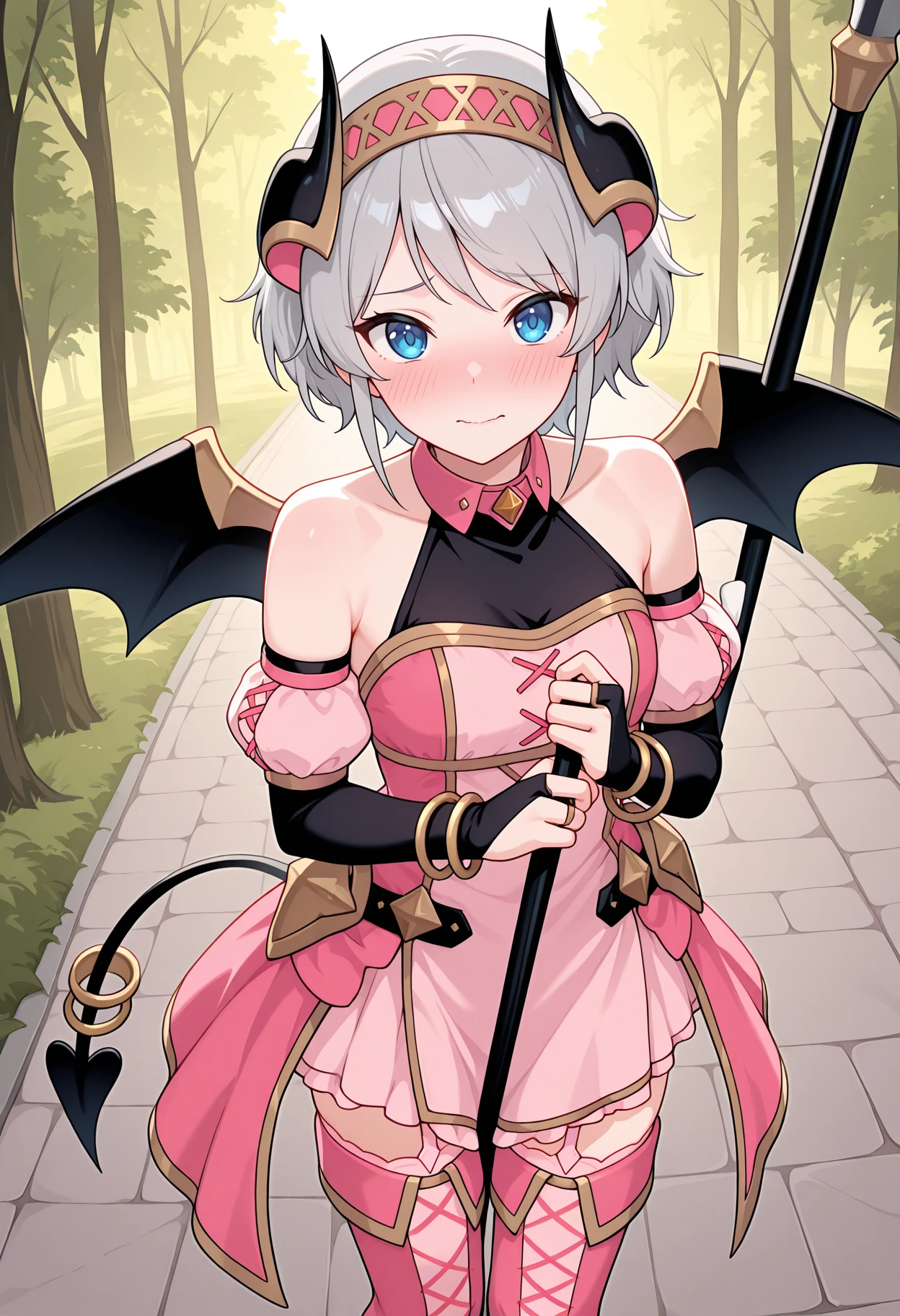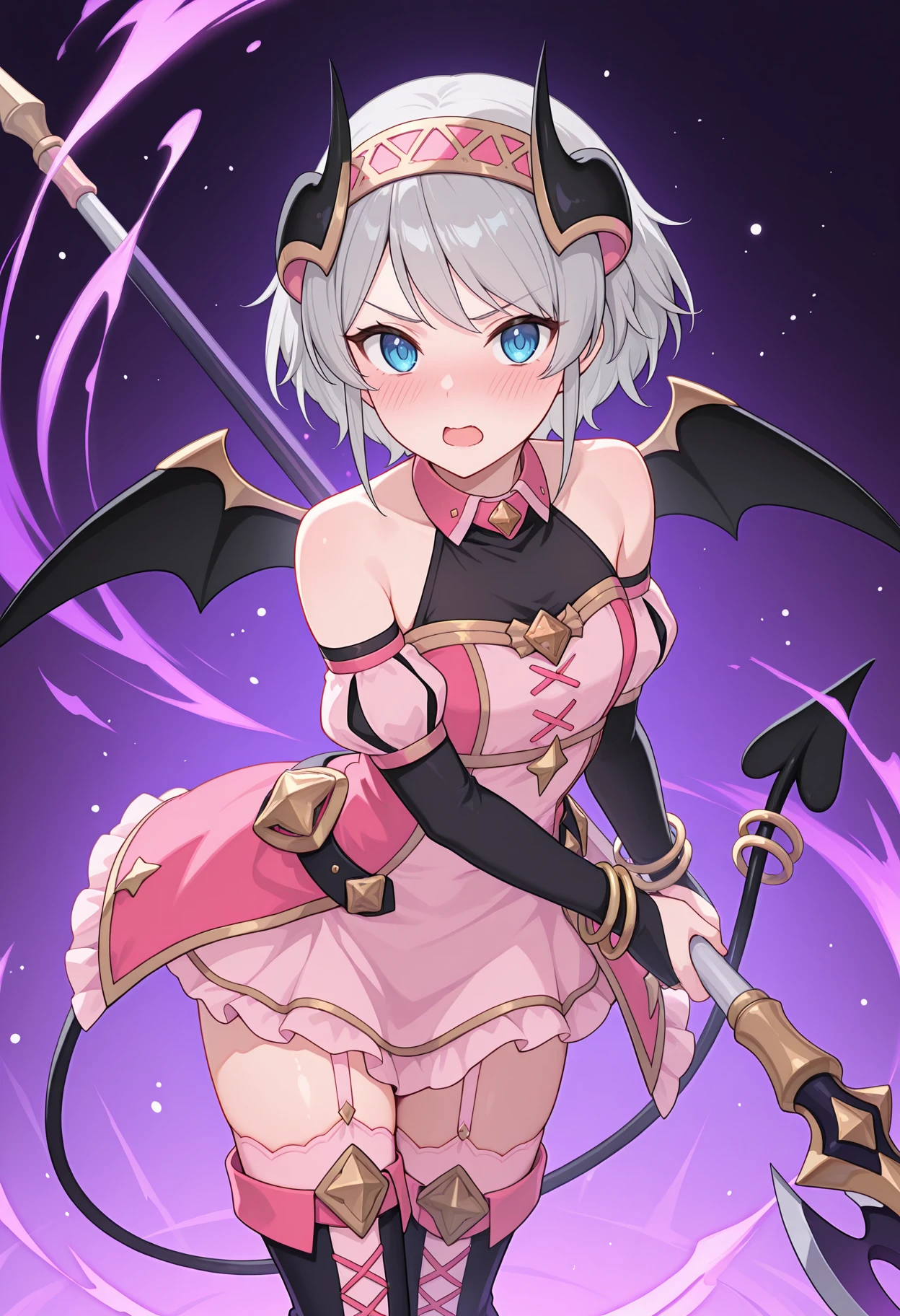 pyoridef, black horns, hairband, demon horns, halterneck, pink collar, black shirt, pink dress, bare shoulders, detached sleeves, puffy sleeves, bracelet, bridal gauntlets, black belt, garter straps, thighhighs, thigh boots, demon wings, demon tail, tail ornament,