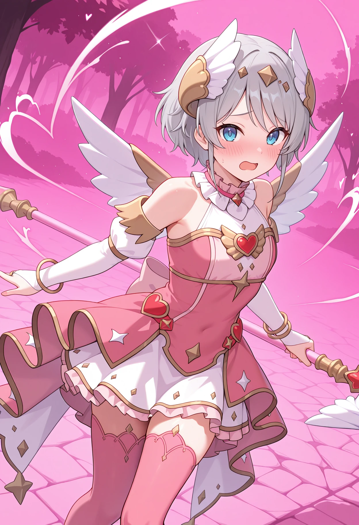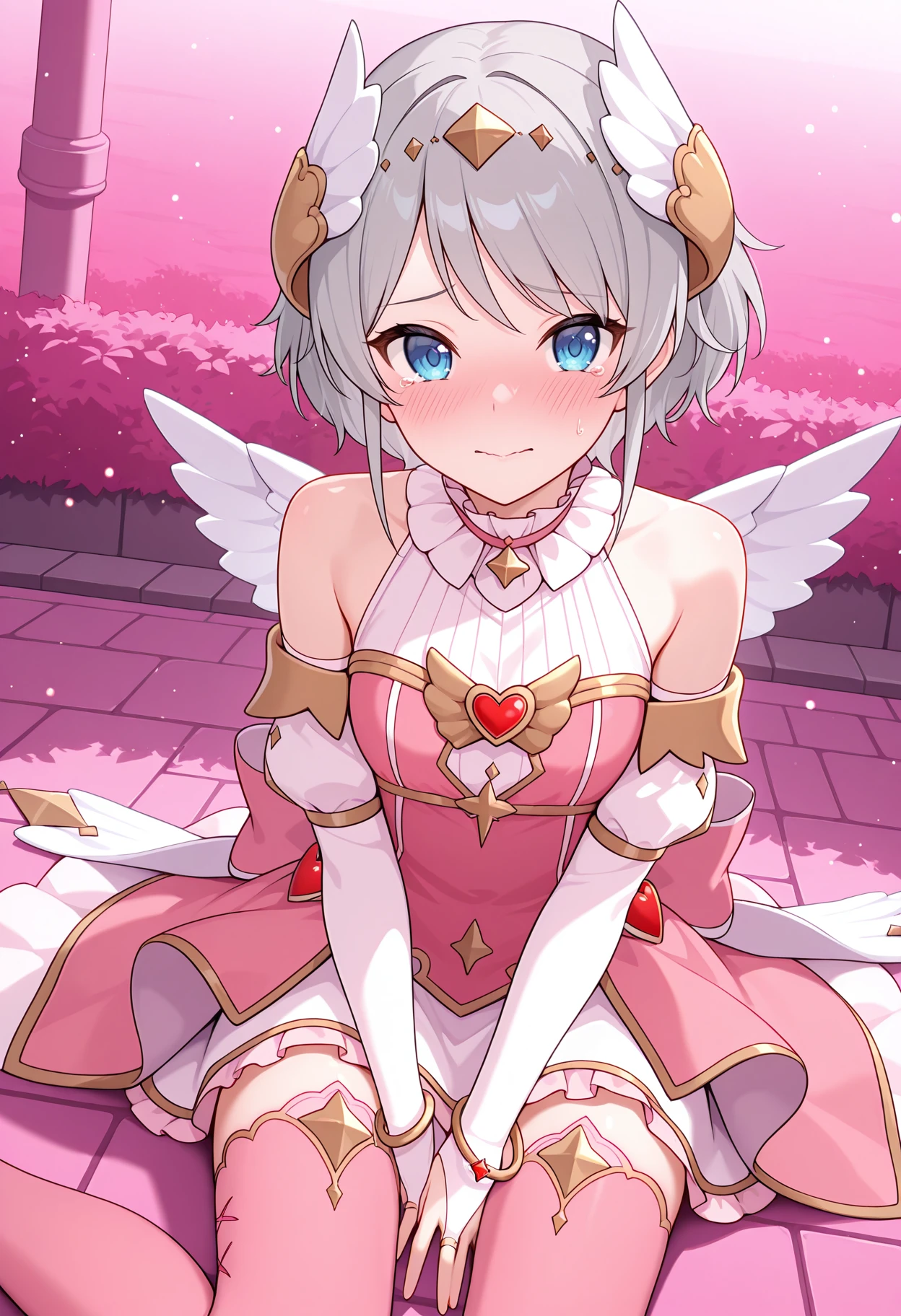 pyoriang, wing hair ornament, white shirt, frilled collar, ribbed shirt, pink dress, bare shoulders, heart ornament, wing ornament, detached sleeves, white sleeves, bracelet, bridal gauntlets, white skirt, overskirt, pink thighhighs, white wings,