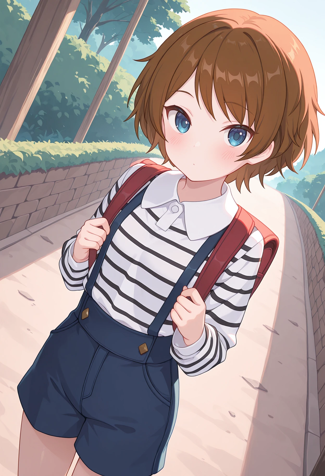 striped shirt, black stripes, collared shirt, white shirt, long sleeves, suspenders, blue shorts,