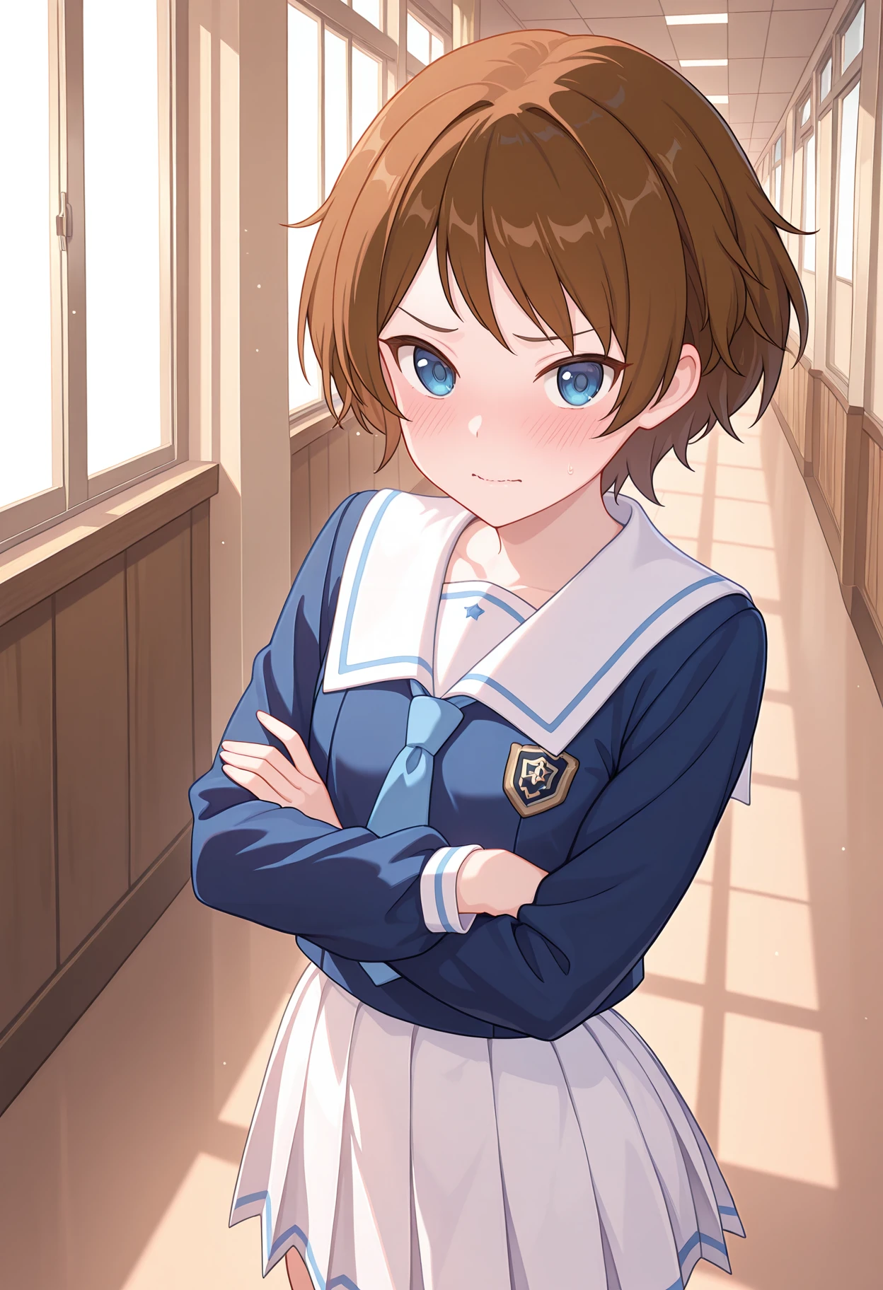 school uniform, white sailor collar, blue shirt, long sleeves, blue necktie, white skirt, pleated skirt,