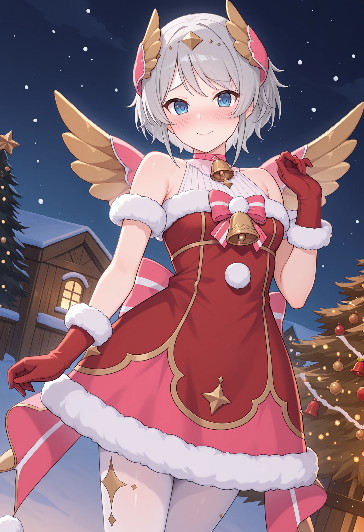 pyorimas, wing hair ornament, pink choker, white shirt, ribbed shirt, red dress, striped bow, bell, fur-trimmed dress, fur-trimmed sleeves, pom pom \(clothes\), sleeveless dress, fur-trimmed gloves, red gloves, back bow, white pantyhose, golden wings,