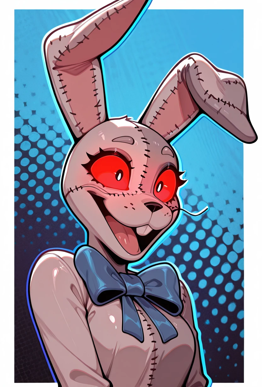 vannyfnaf, rabbit ears, 1girl, red sclera, blue bowtie, open mouth, smile, stitches, buck teeth,,