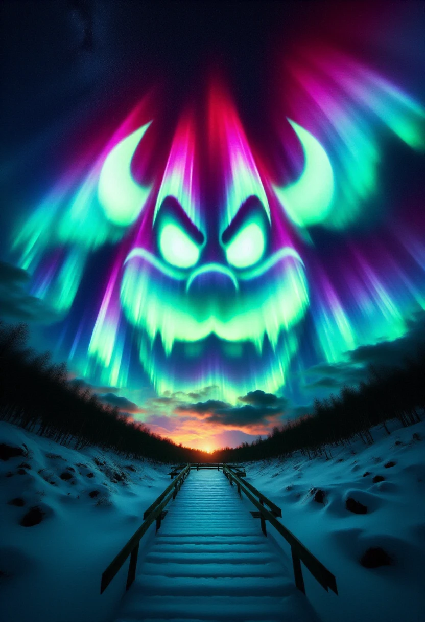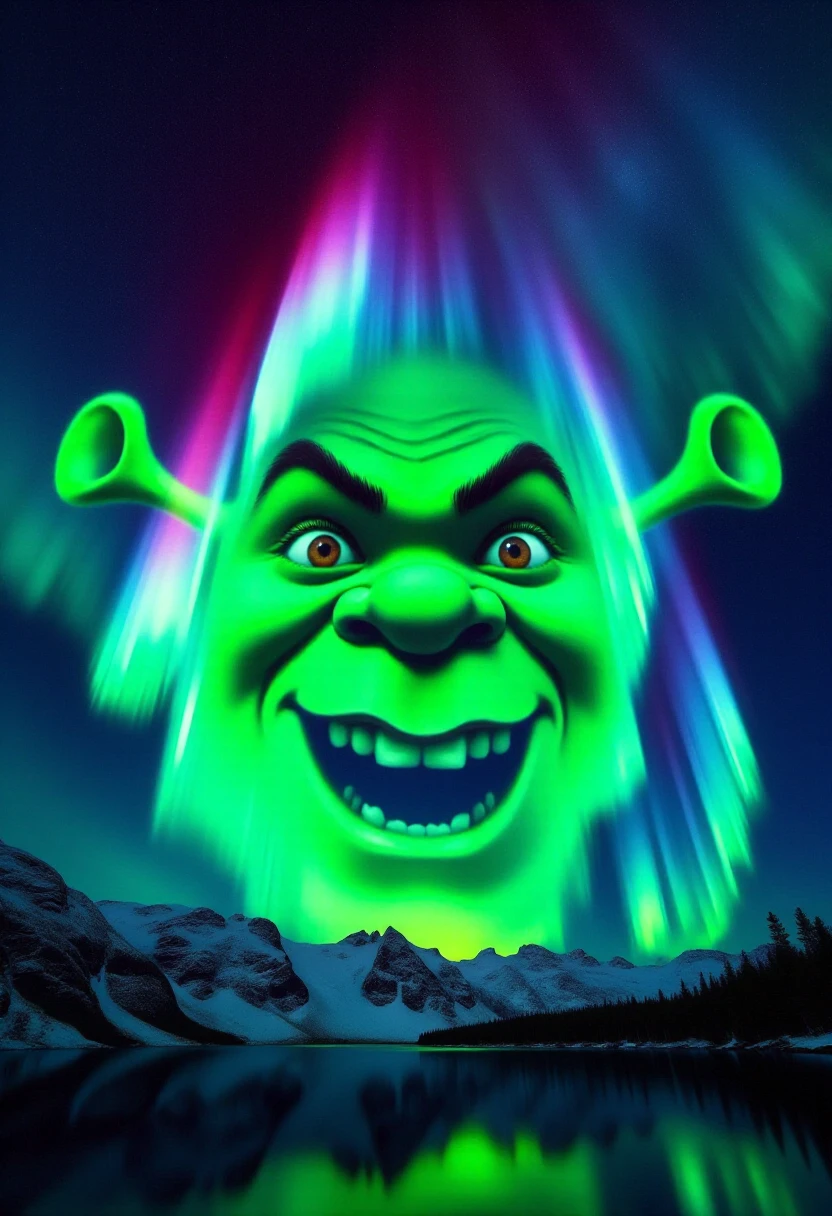 Digital artwork showcasing a breathtaking aurora borealis display in a nighttime landscape. The central subject is (SUBJECT), stylized in glowing, ethereal colors, rendered in vibrant hues of (COLORS), appearing to be formed by the swirling aurora lights.