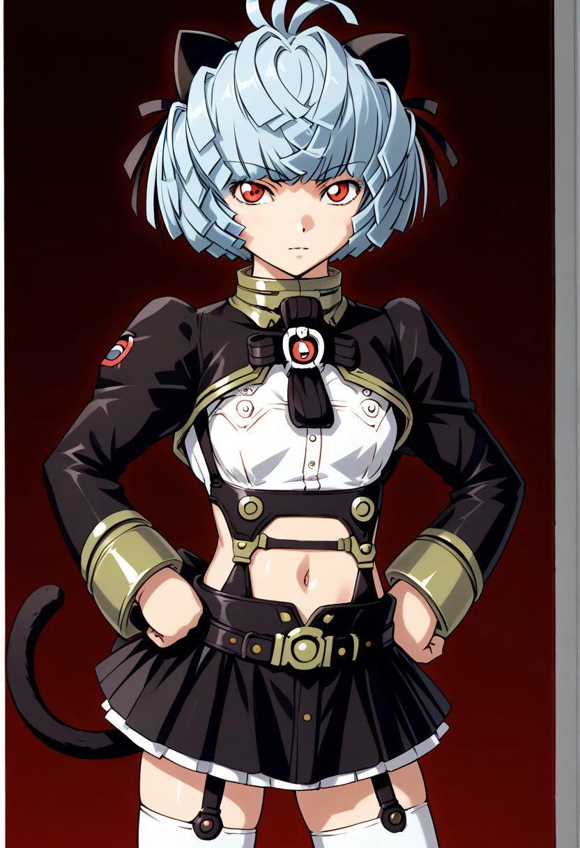 Prompt:mobile suit gundam 00, gundam 00, hayana, red eyes, skirt, short hair, navel, black skirt, cropped jacket,ahoge, ribbon, long sleeves, blue hair, pleated skirt, hair ribbon, animal ears, midriff, smile, puffy sleeves, Garter straps, garter belt.
