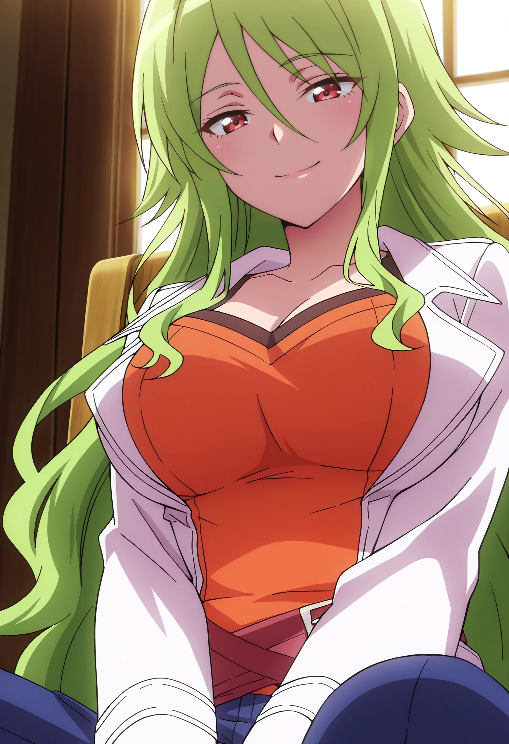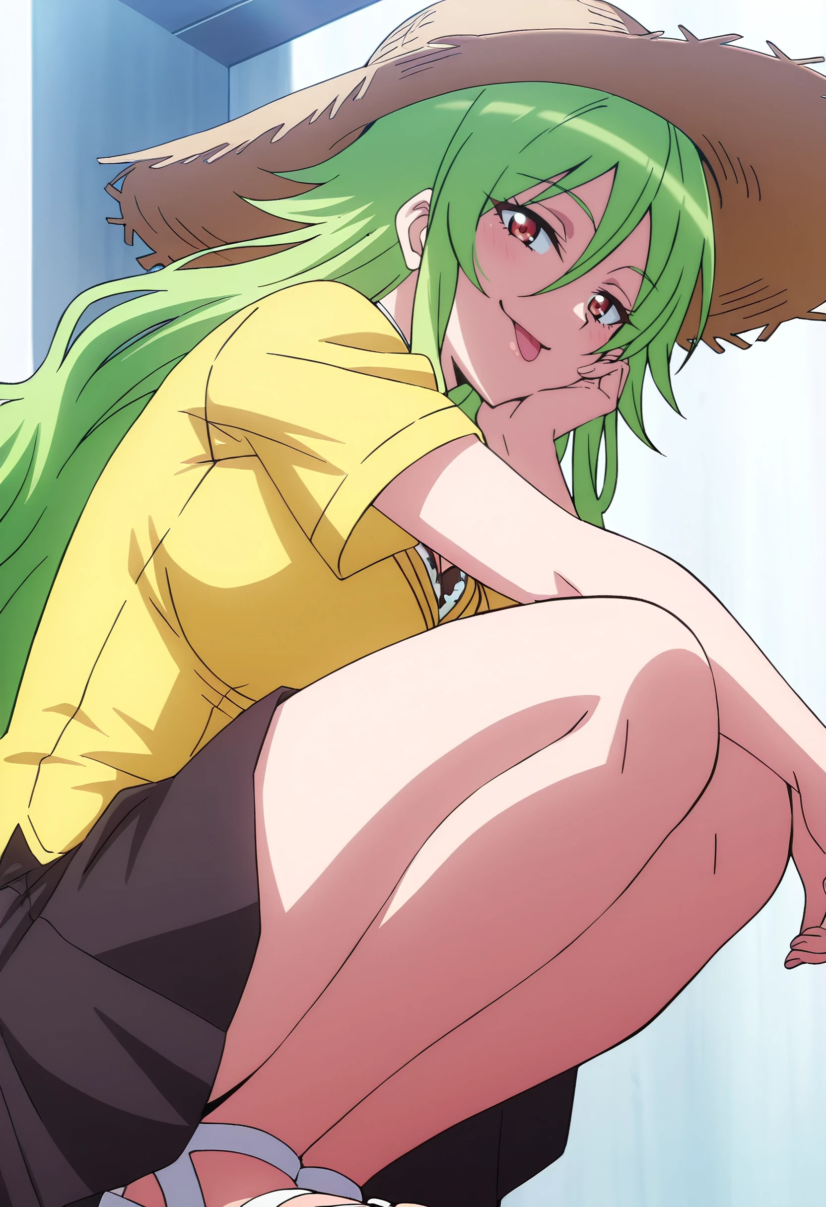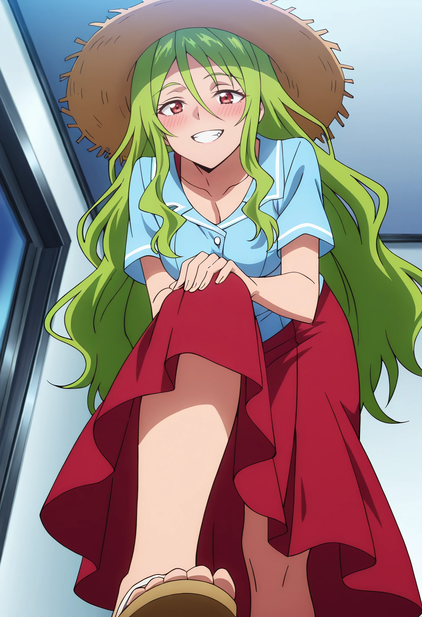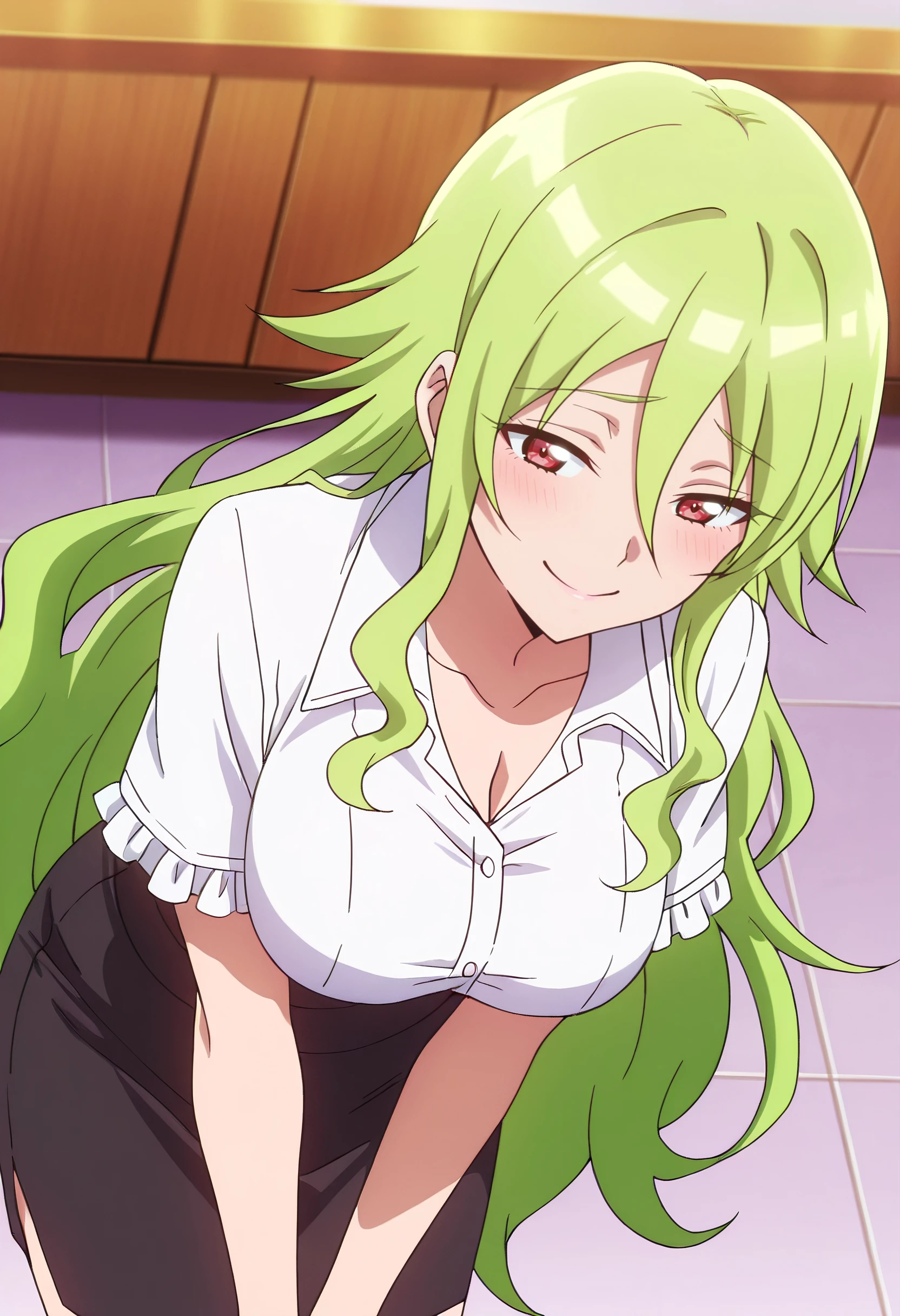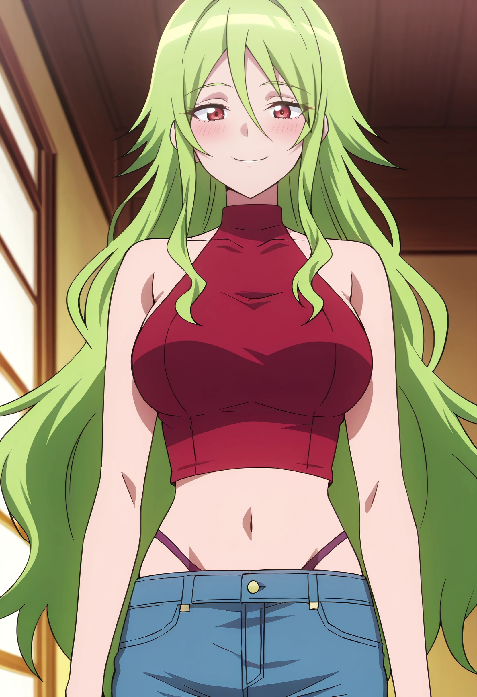 MOKMimosa, green hair, long hair, red eyes, hair between eyes, very long hair,
