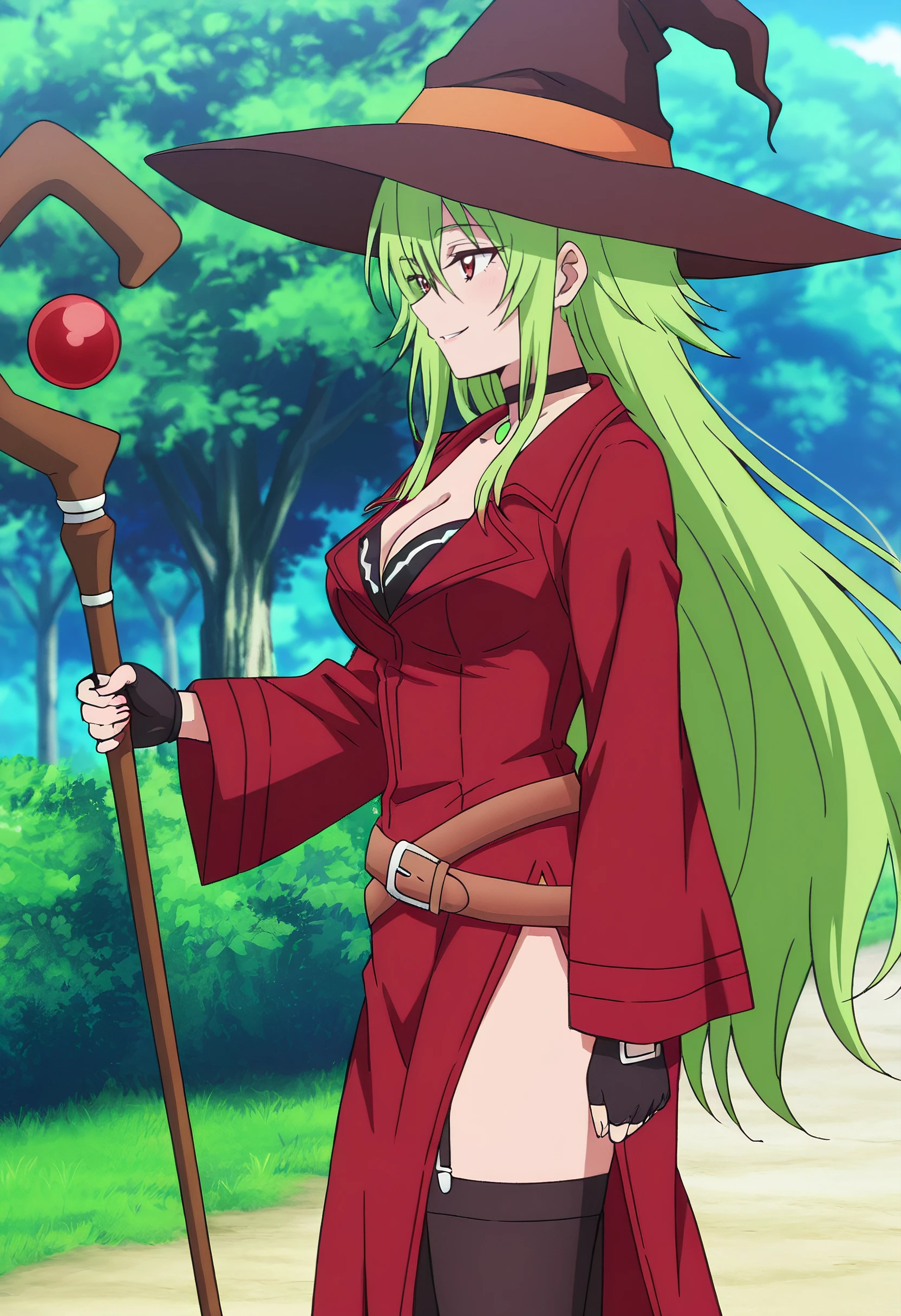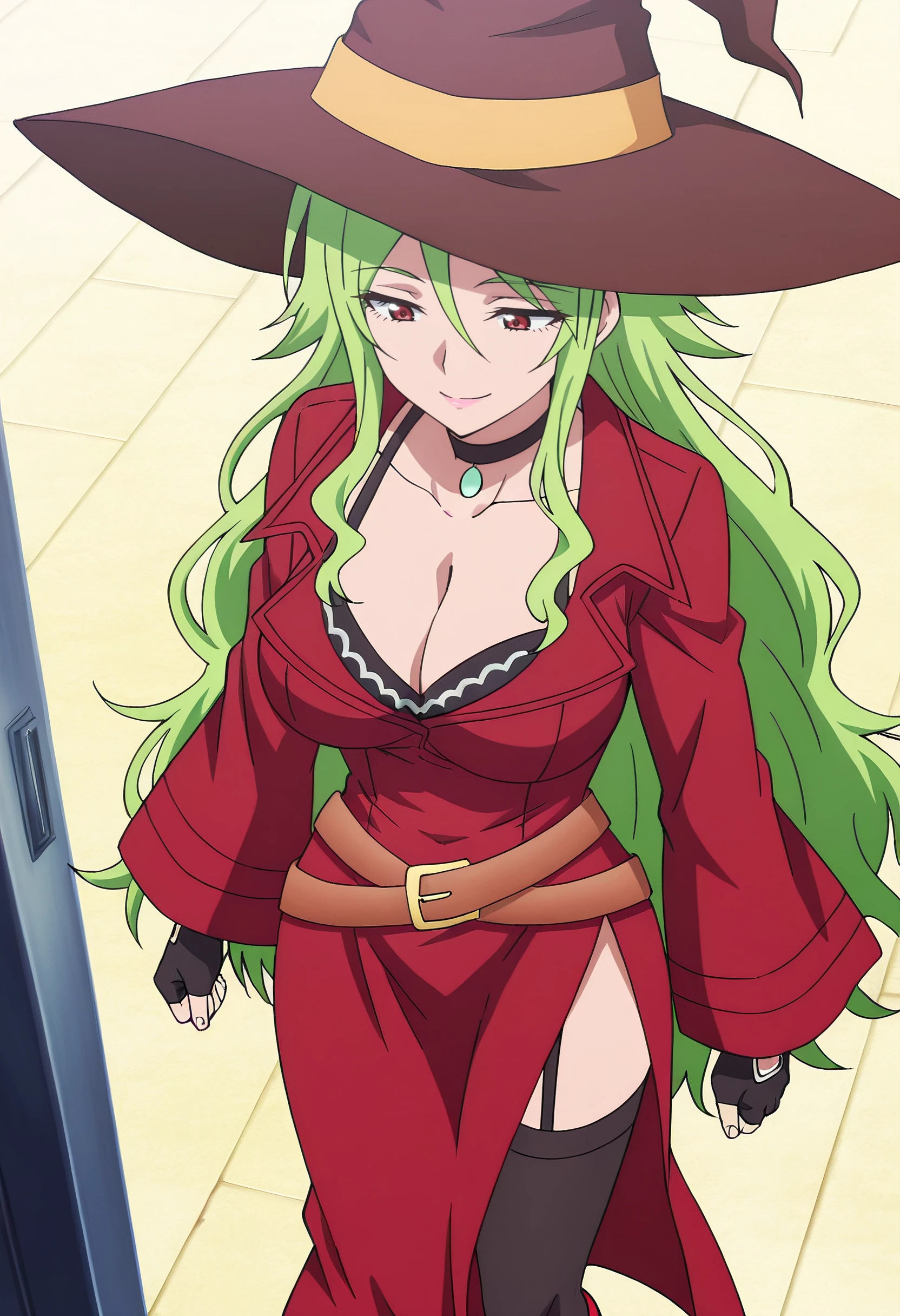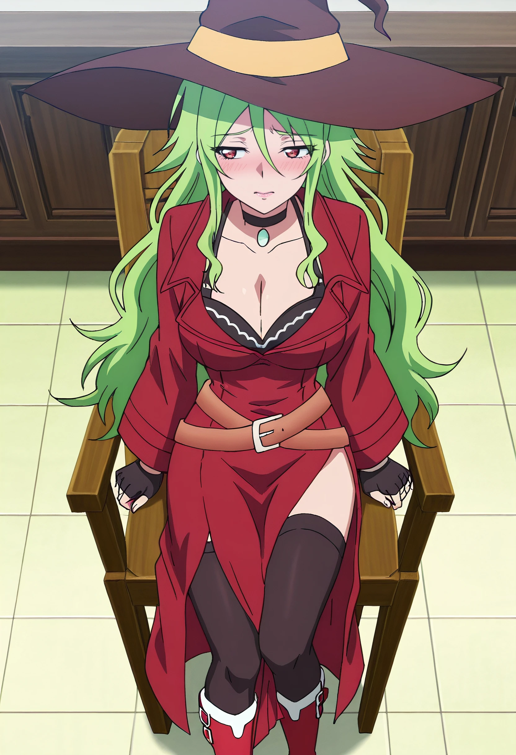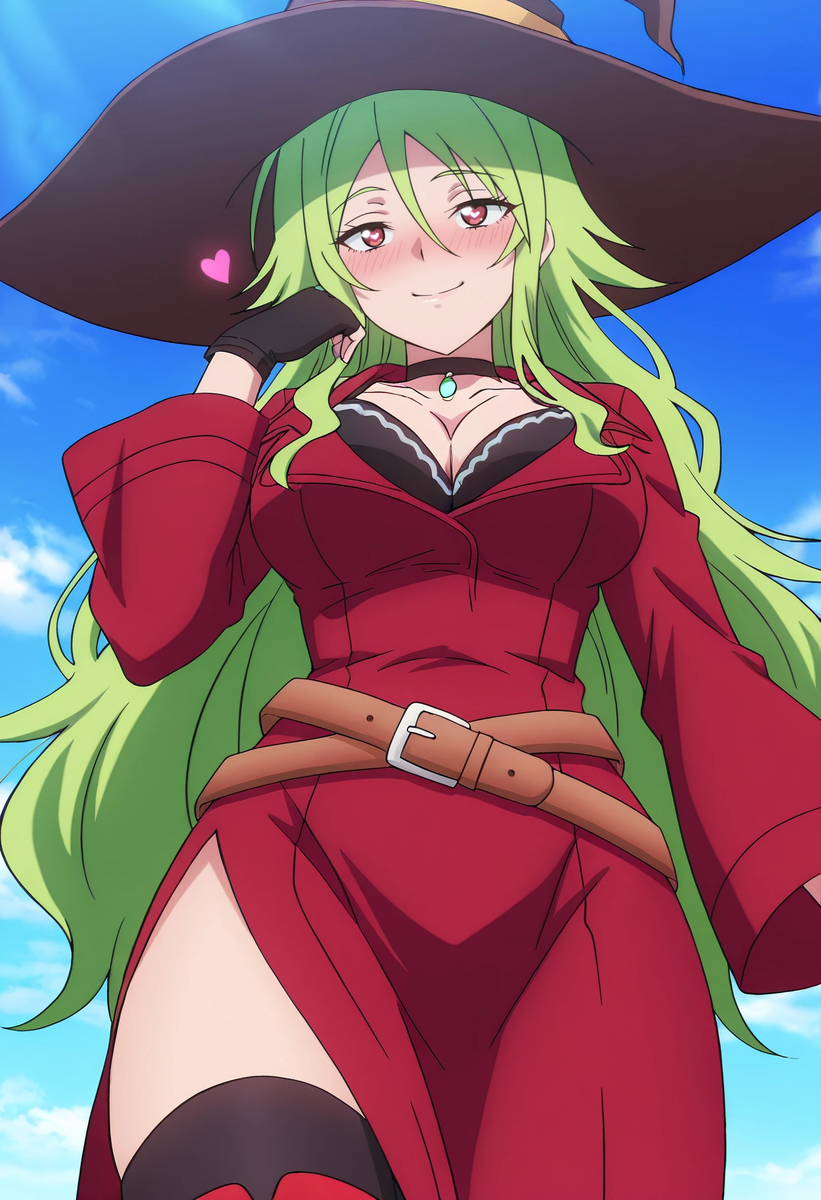 MimosaOutfit, hat, witch hat, witch, choker, cleavage, long sleeves, gloves, black gloves, black choker, belt, dress, red dress, fingerless gloves, jacket, red jacket, boots, black bra, bra, red footwear, thighhighs, black thighhighs, brown belt, wide sleeves, side slit,