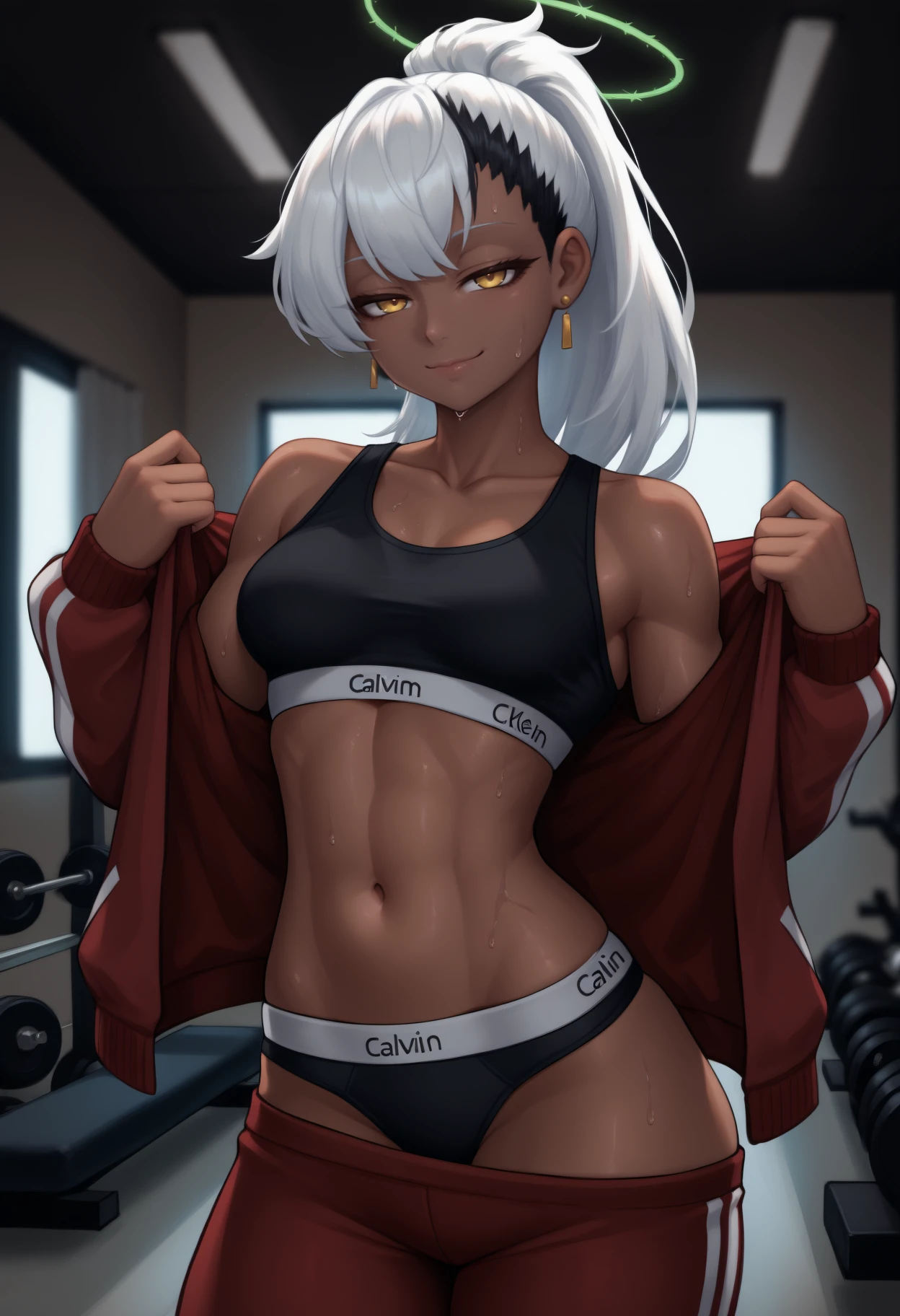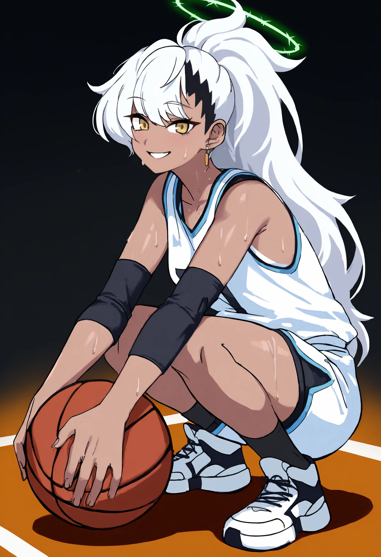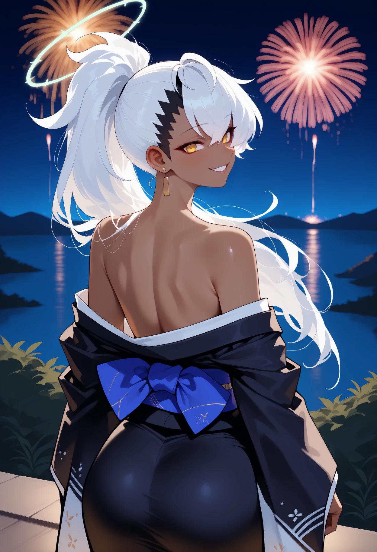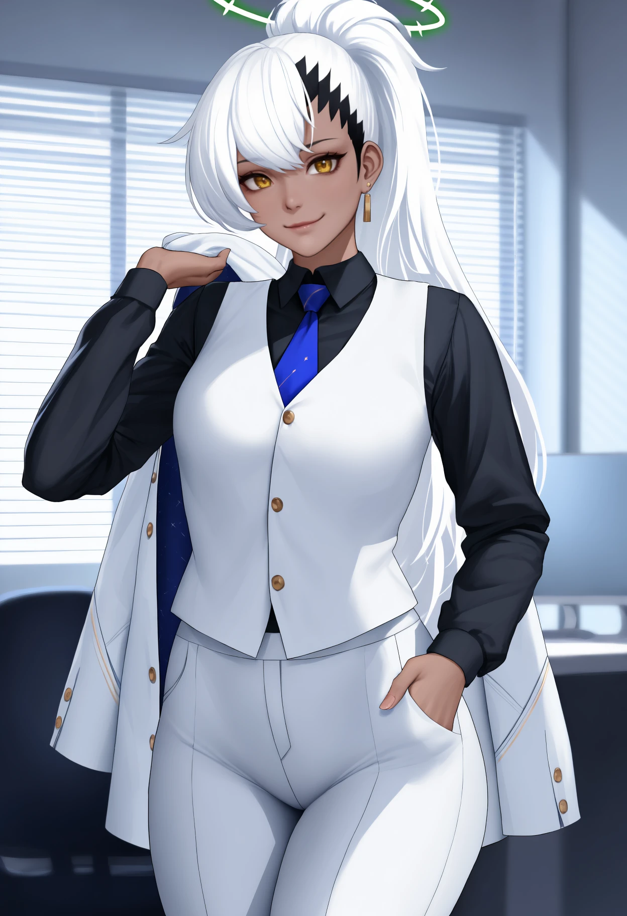 dark-skinned female, multicolored hair, white hair, black hair, ponytail, halo, yellow eyes