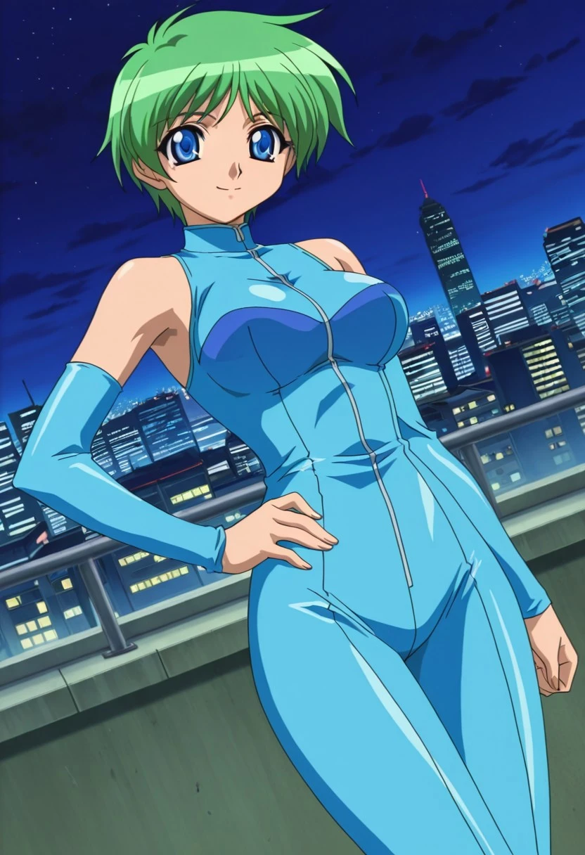 Hazuki,green hair, short_hair, blue_eyes, large_breasts, (2000s)STYLE,