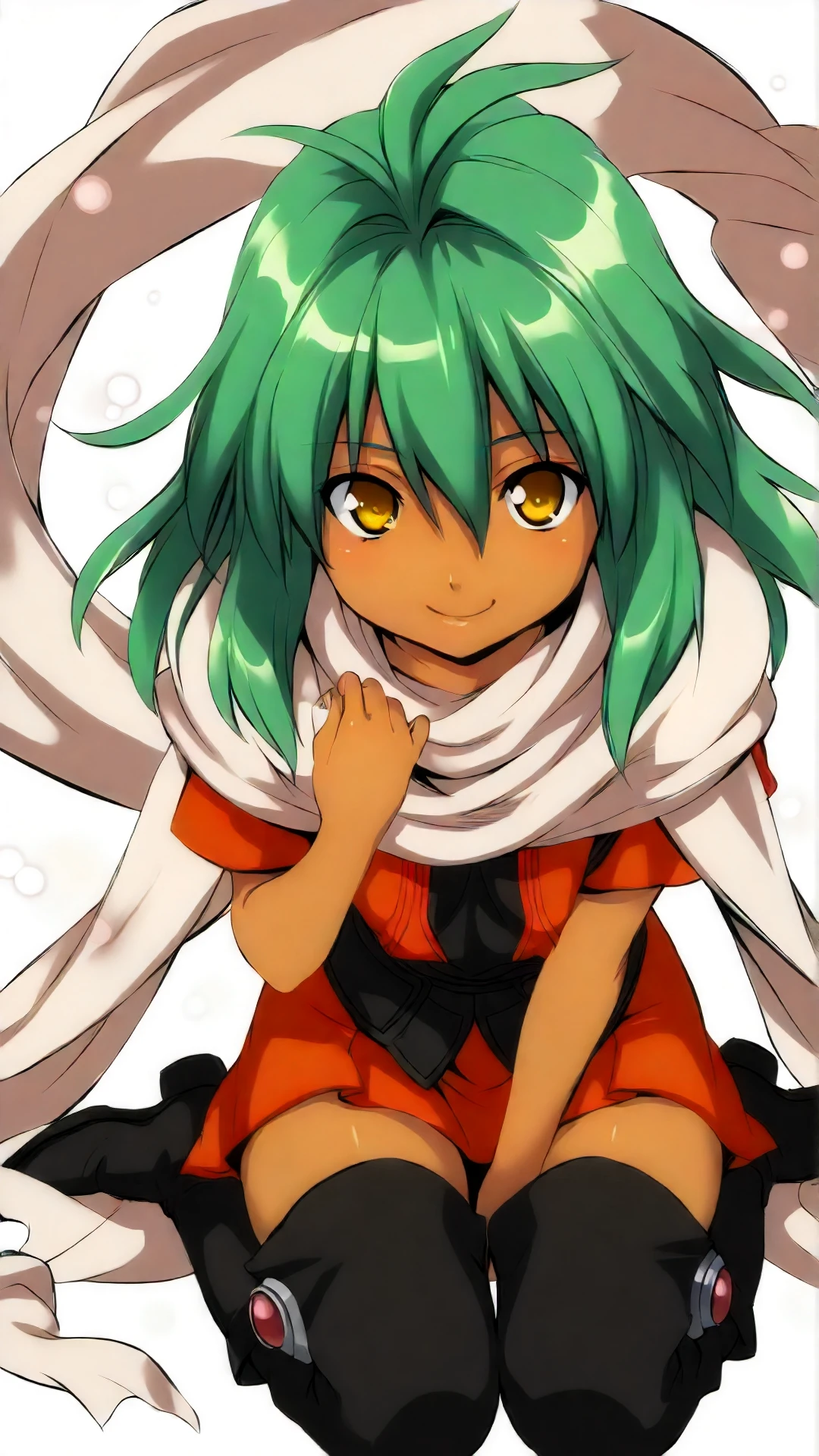 emerada_xenogears, an anime girl, 1girl, solo, long hair, smile, skirt, simple background, thighhighs, white background, sitting, yellow eyes, boots, green hair, dark skin, scarf, dark-skinned female, torn clothes