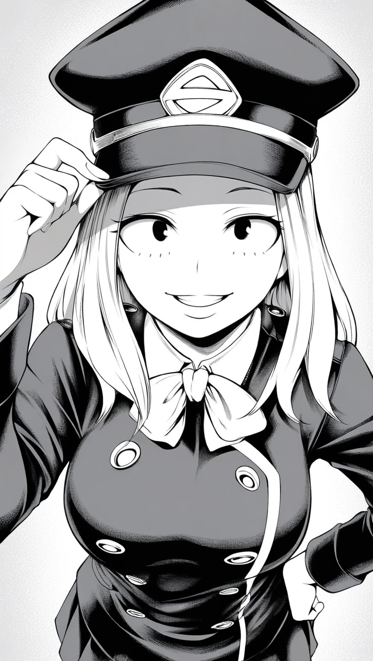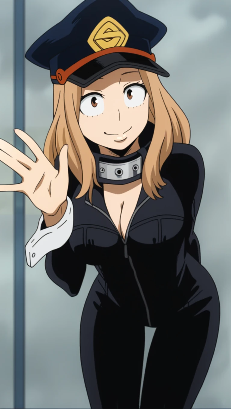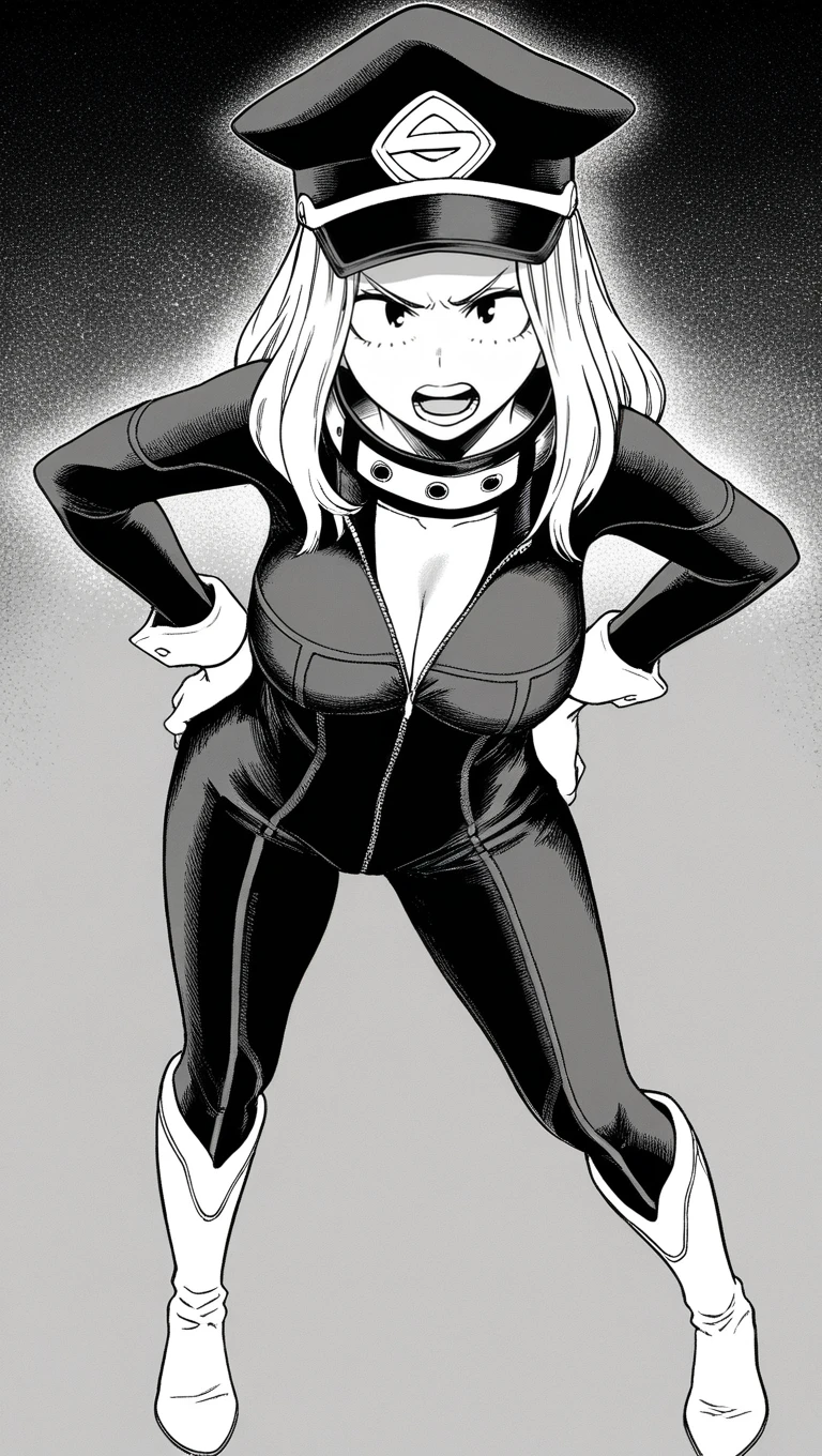 h3r0 outf1t, blue and yellow peaked cap, black bodysuit, full-length zipper, white wrist cuffs, belt collar, white boots, 4n1me style, large breasts, cleavage,