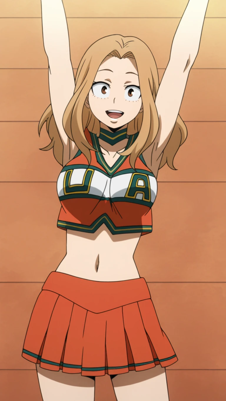 ch33rl34d3r, orange and green crop top, orange and green skirt, green and yellow choker, white and green socks, pink shoes, 4n1me style, navel, medium breasts,