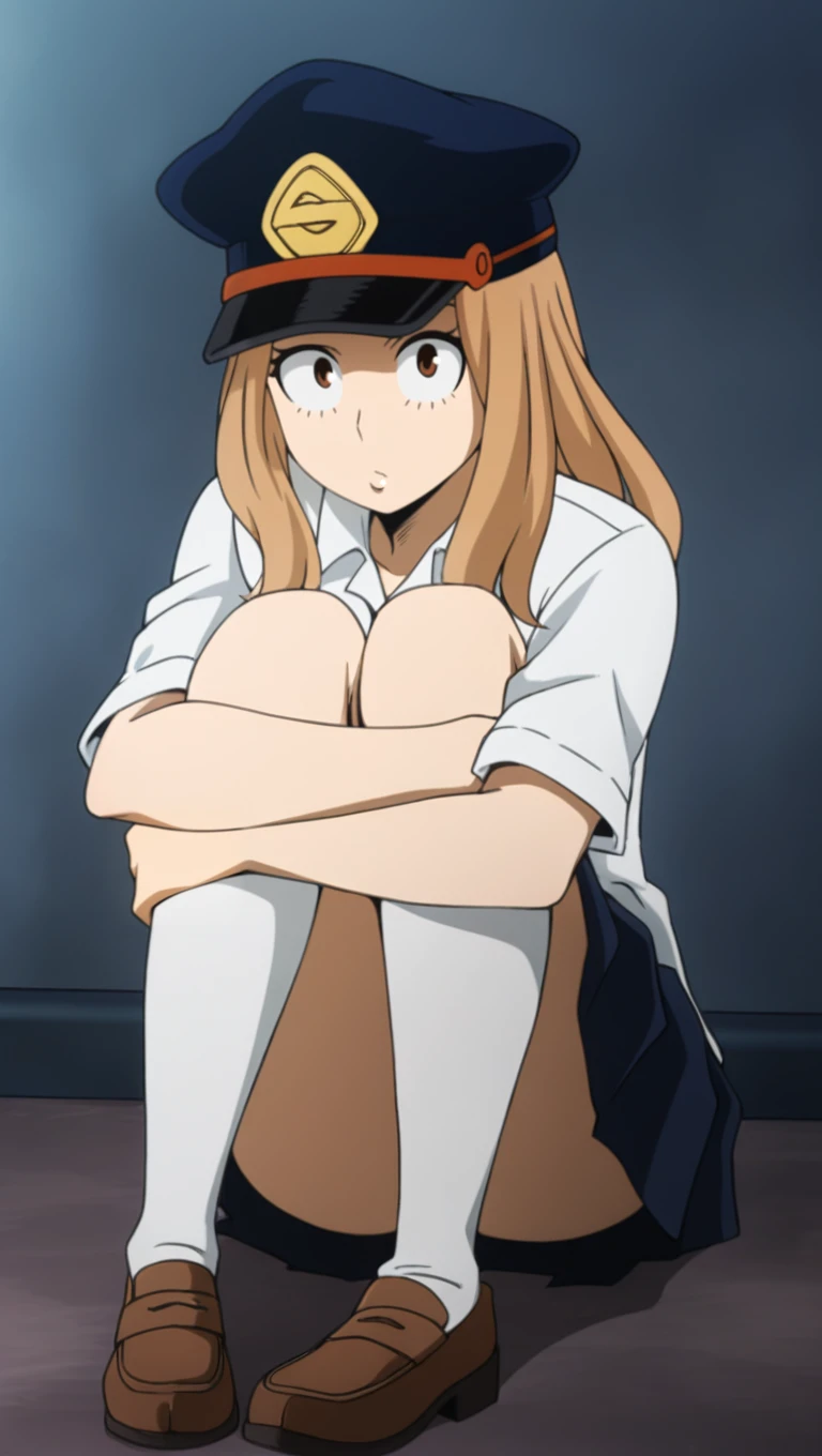 sch001, blue and yellow peaked cap, blue double-breasted blazer, blue pleated skirt, orange bowtie, white socks, brown loafers, 4n1me style,