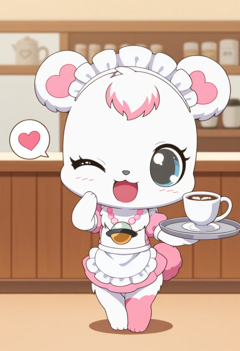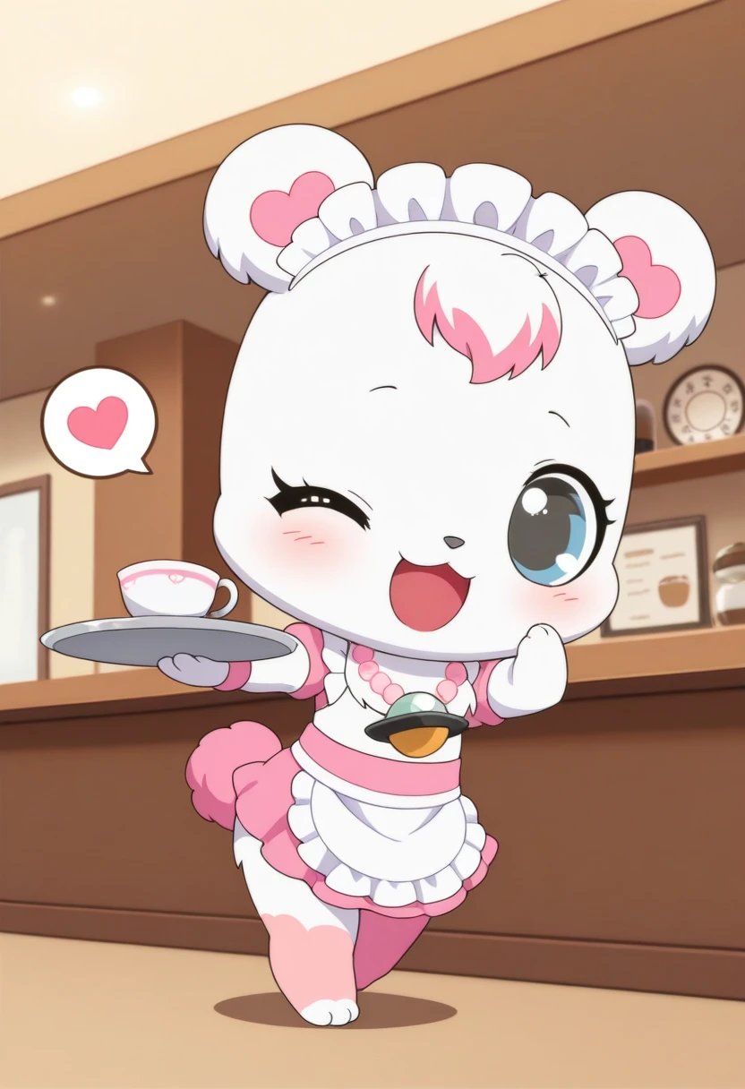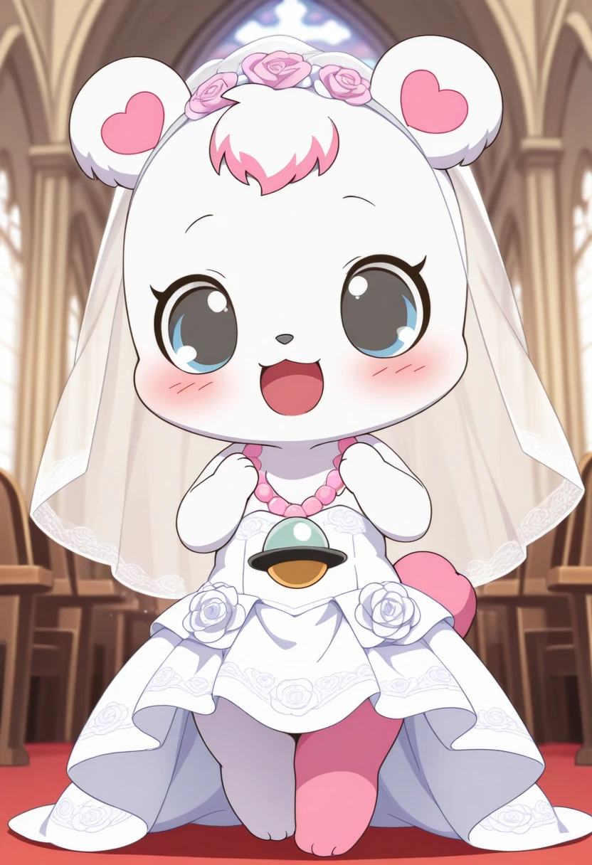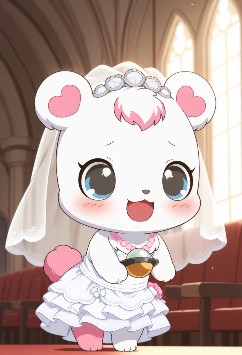 promps: labrajp, chibi, feral, multicolored hair, pink tail, tufted fur, furry, one pink leg, necklace, bear,