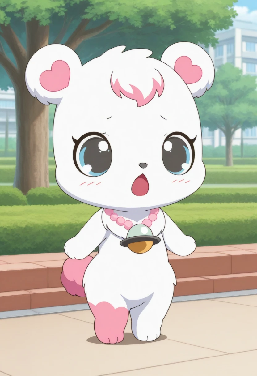 labrajp, chibi, feral, multicolored hair, pink tail, tufted fur, furry, one pink leg, necklace, bear,