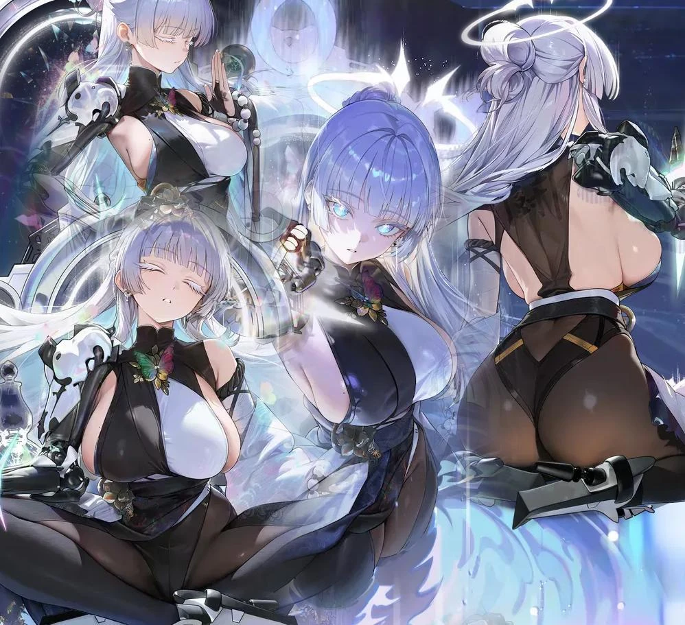 nytnkk, large breasts, blunt bangs, bangs, very long hair, white hair, platinum hair, halo, white eyelashes, mole on breast,