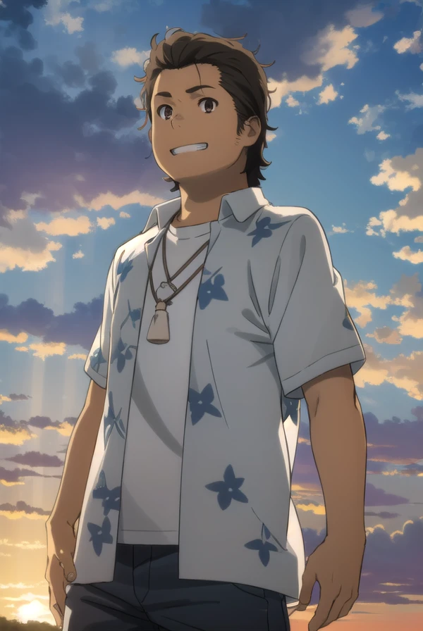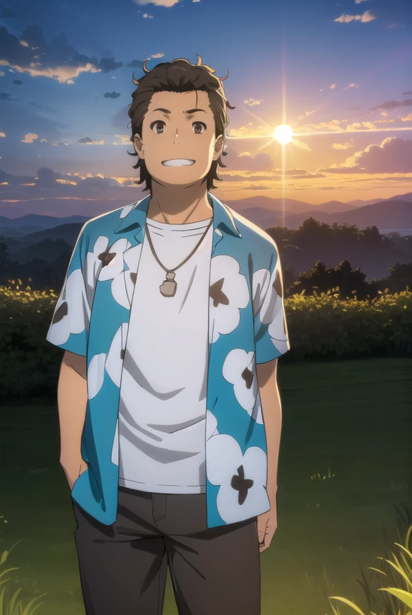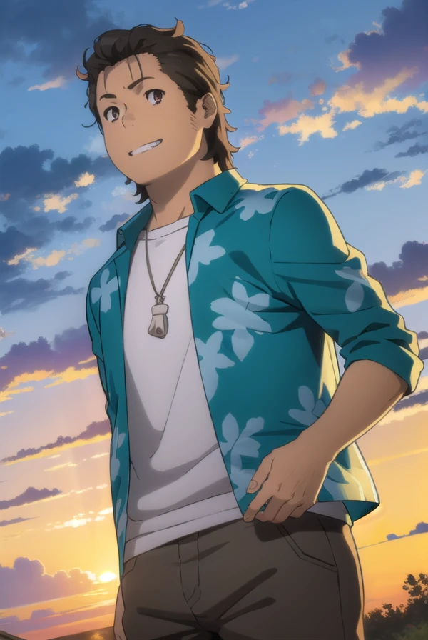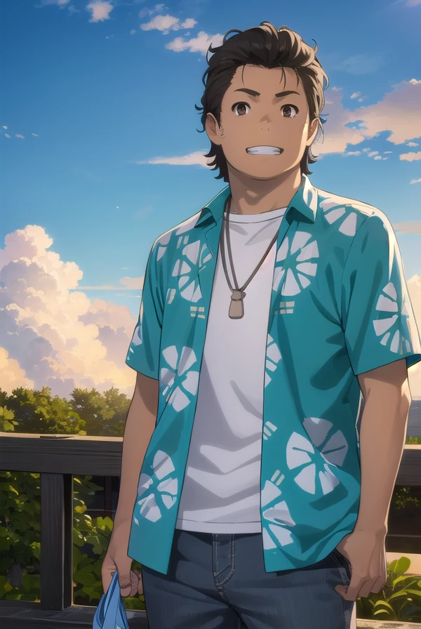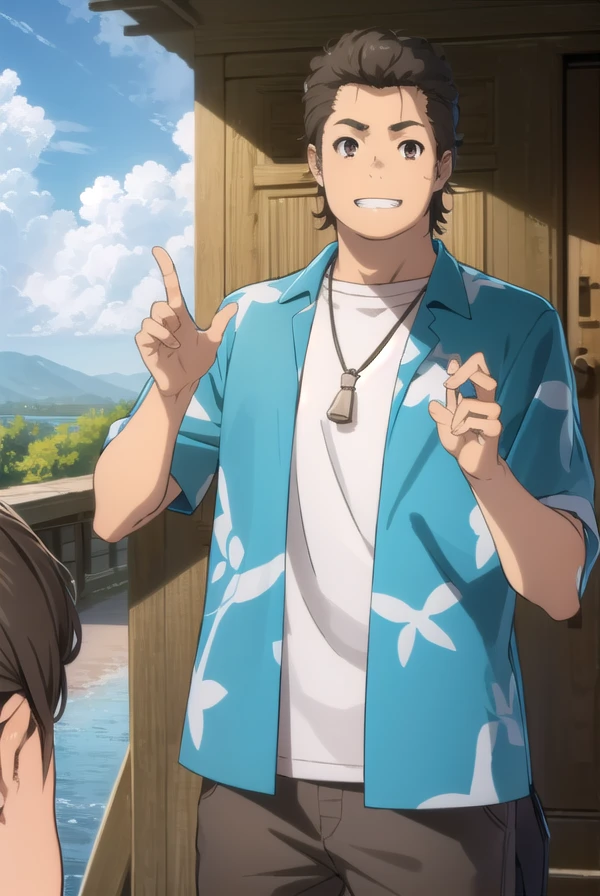 shirt, open clothes, pants, necklace, sandals, hawaiian shirt,