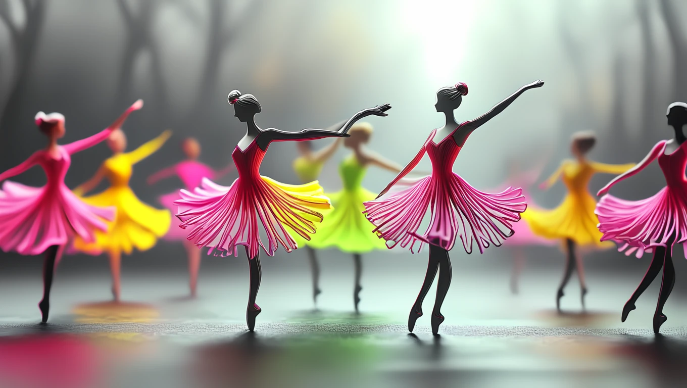 black or white background, ballerina style dancers, neon colored outfits, somewhat translucent, illustration, black line work, etc