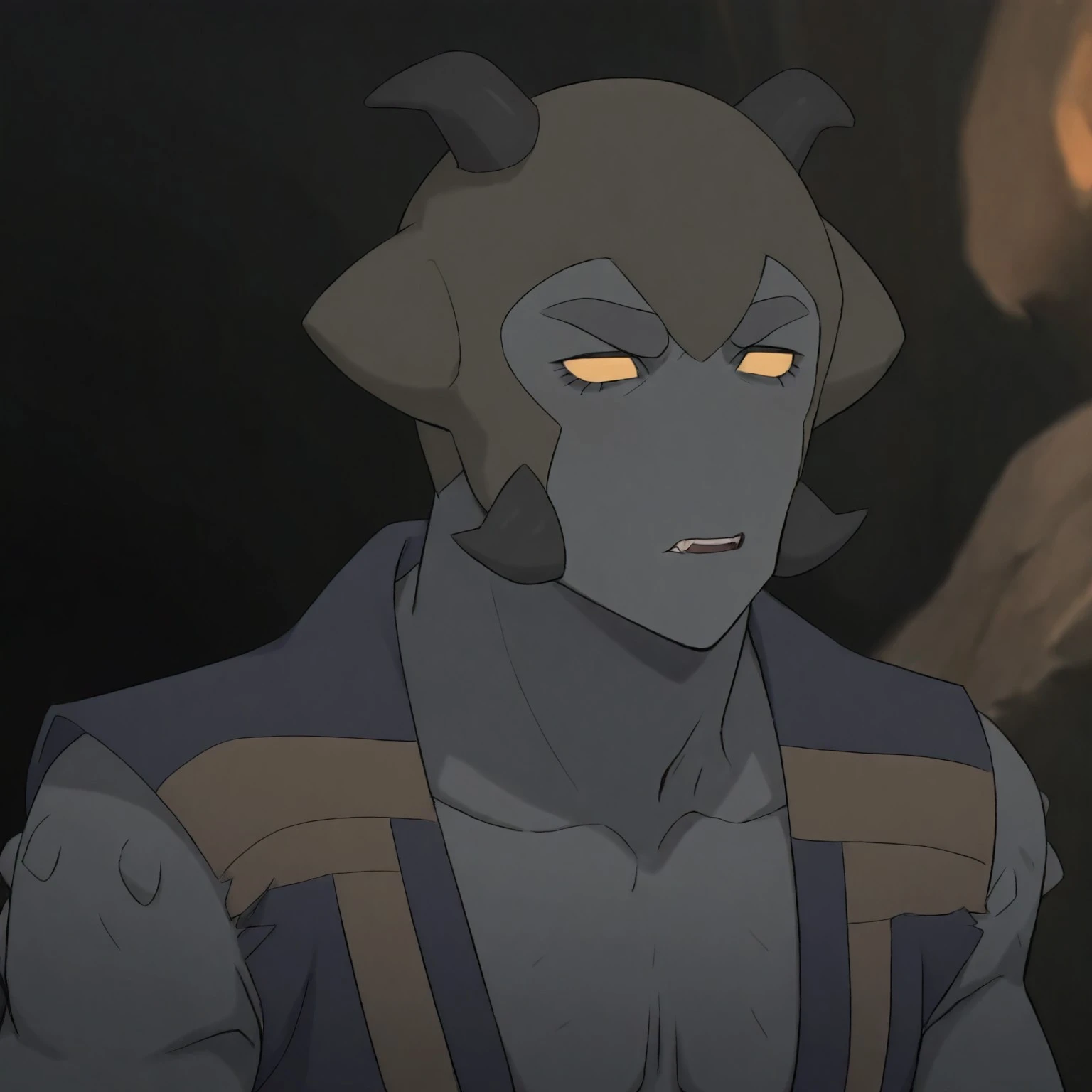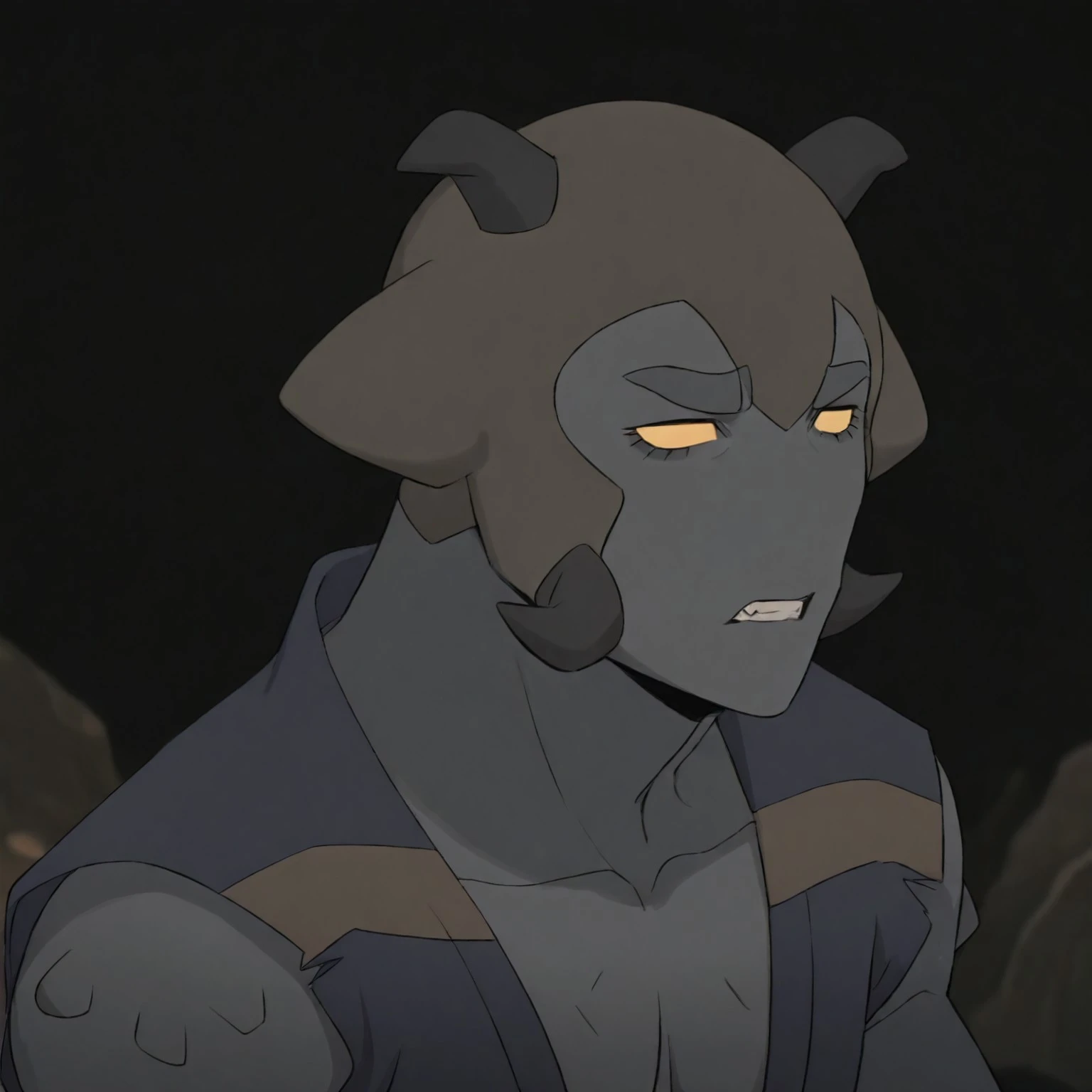 Rax, alien, gray skin, small black horns, yellow eyes, rocky skin, No pupils,