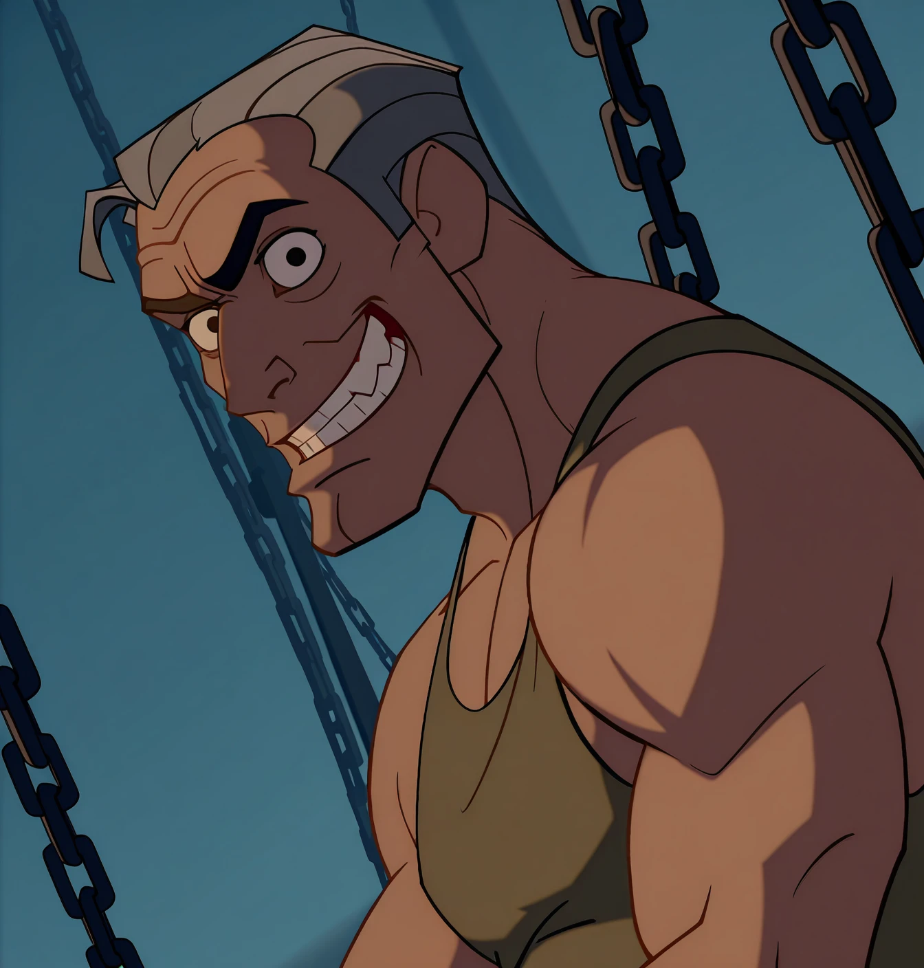 Lyle Tiberius Rourke: lyl3, 1boy, solo, black eyes, short hair, grey hair, male focus, suit, collared shirt, uniform, brown jacket, breast pocket, old, old man, muscular