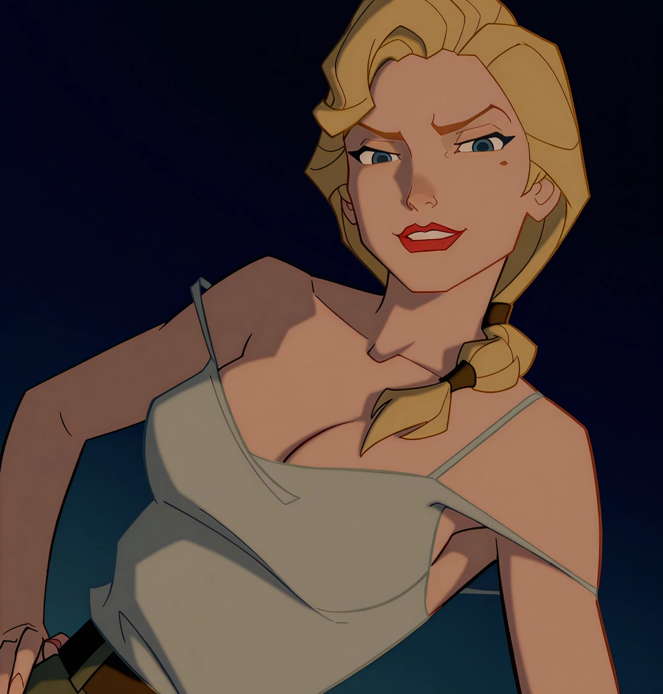 Helga Sinclair: helga sinclair, 1girl, solo, dark blue eyes, breasts, medium breasts, blonde hair, long hair, braid, mole under eye, single braid, lipstick, hair over shoulder, red lips, tank top, white shirt, strap slip, bare shoulders, sleeveless, brown gloves