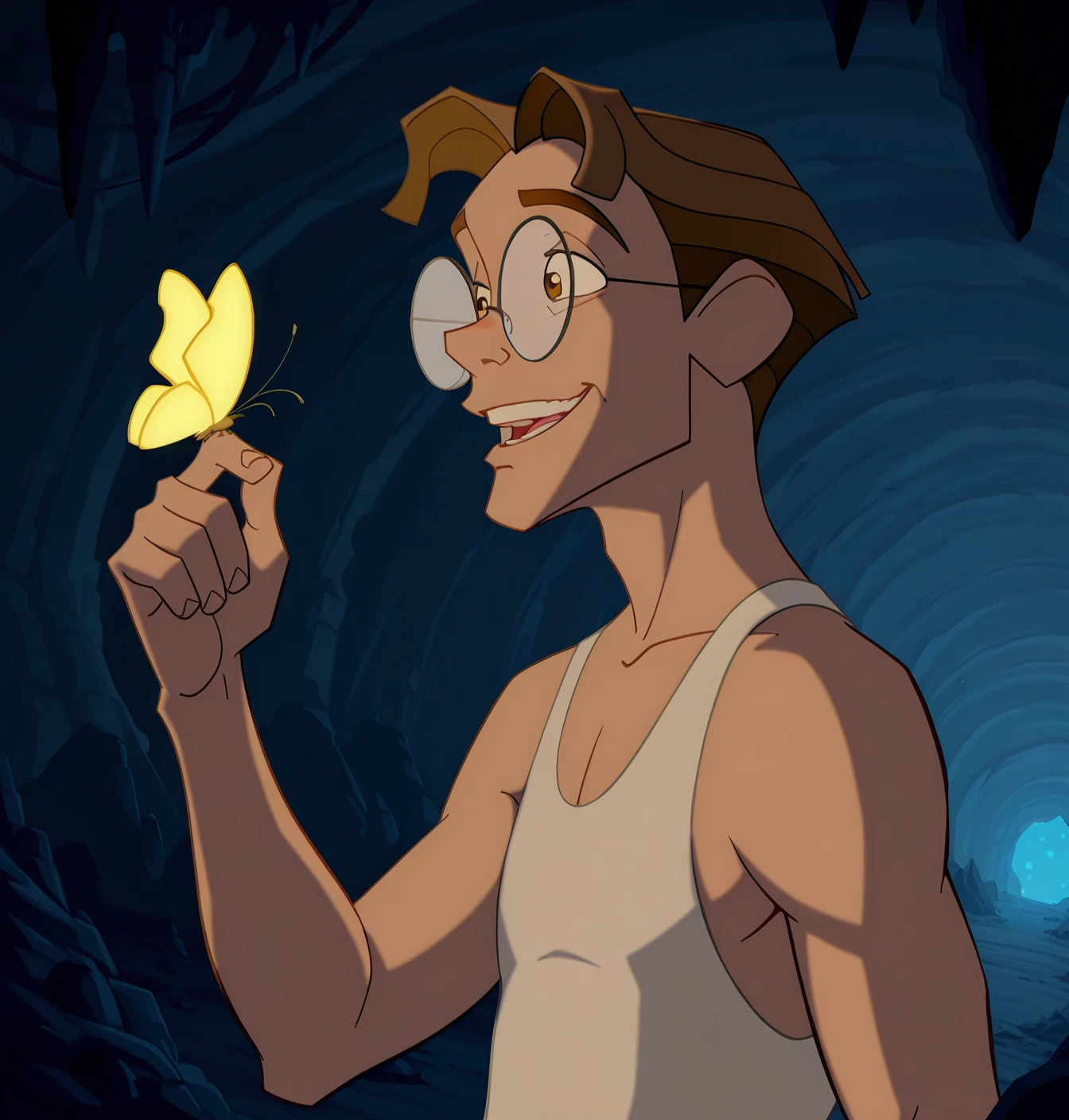 Milo James Thatch: m1l0, solo, 1boy, male focus, brown eyes, brown hair, short hair, glasses, round eyewear, white shirt, green vest, brown vest, red bow, long sleeves, bowtie