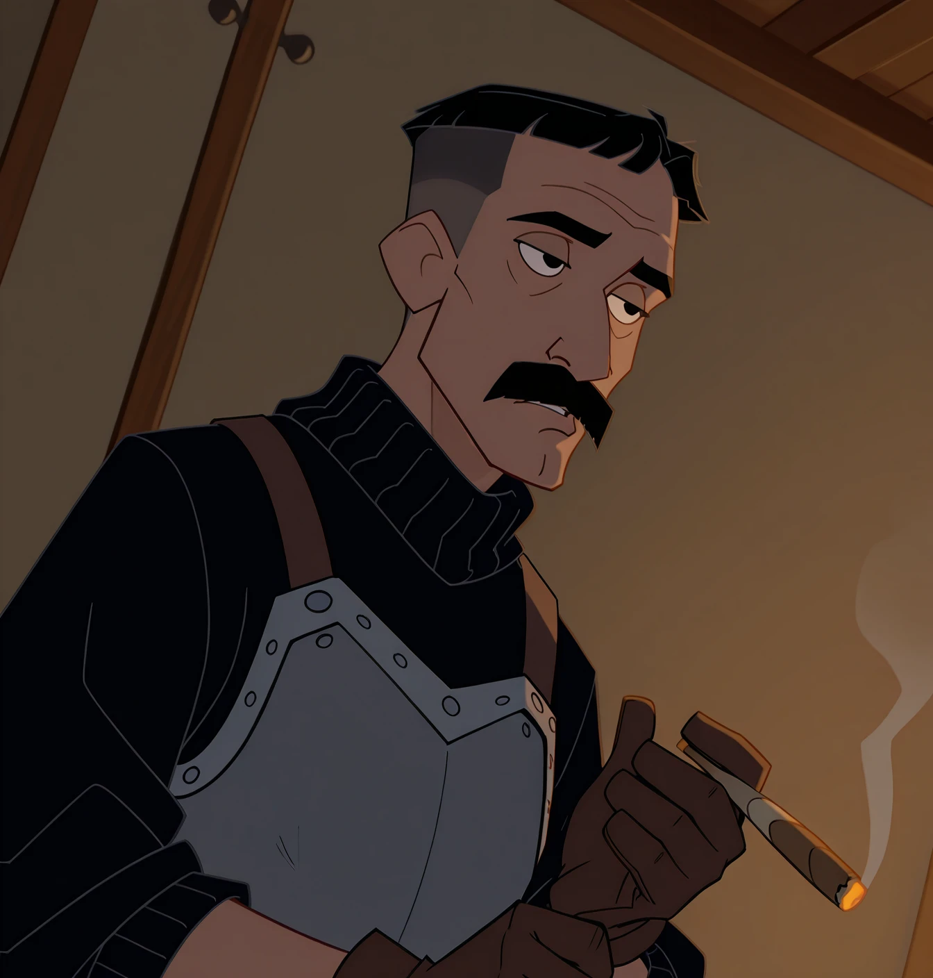 Vincenzo Santorini: v1nc3nz0, solo, 1boy, male focus, black eyes, black hair, very short hair, undercut, facial hair, mustache, armor, breastplate, black sweater, brown gloves