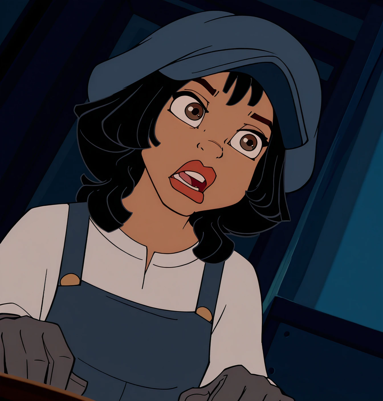 Audrey Ramirez: audrey ramirez, 1girl, brown eyes, solo, thick lips, short hair, black hair, long sleeves, hat, white shirt, dark skin, apron, dark-skinned female, lips, lipstick, beret, blue headwear, red lips, overalls, blue overalls, grey gloves