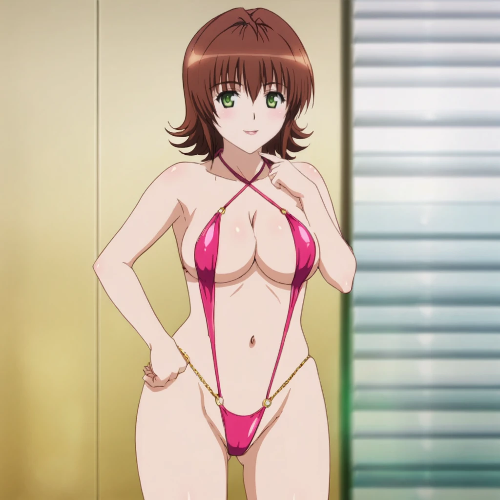 Trigger with red swimsuit: MikadoMisc, brown hair, solo, pink one-piece swimsuit, green eyes, medium breasts, 1girl, short hair, navel, cleavage, slingshot swimsuit, cowboy shot