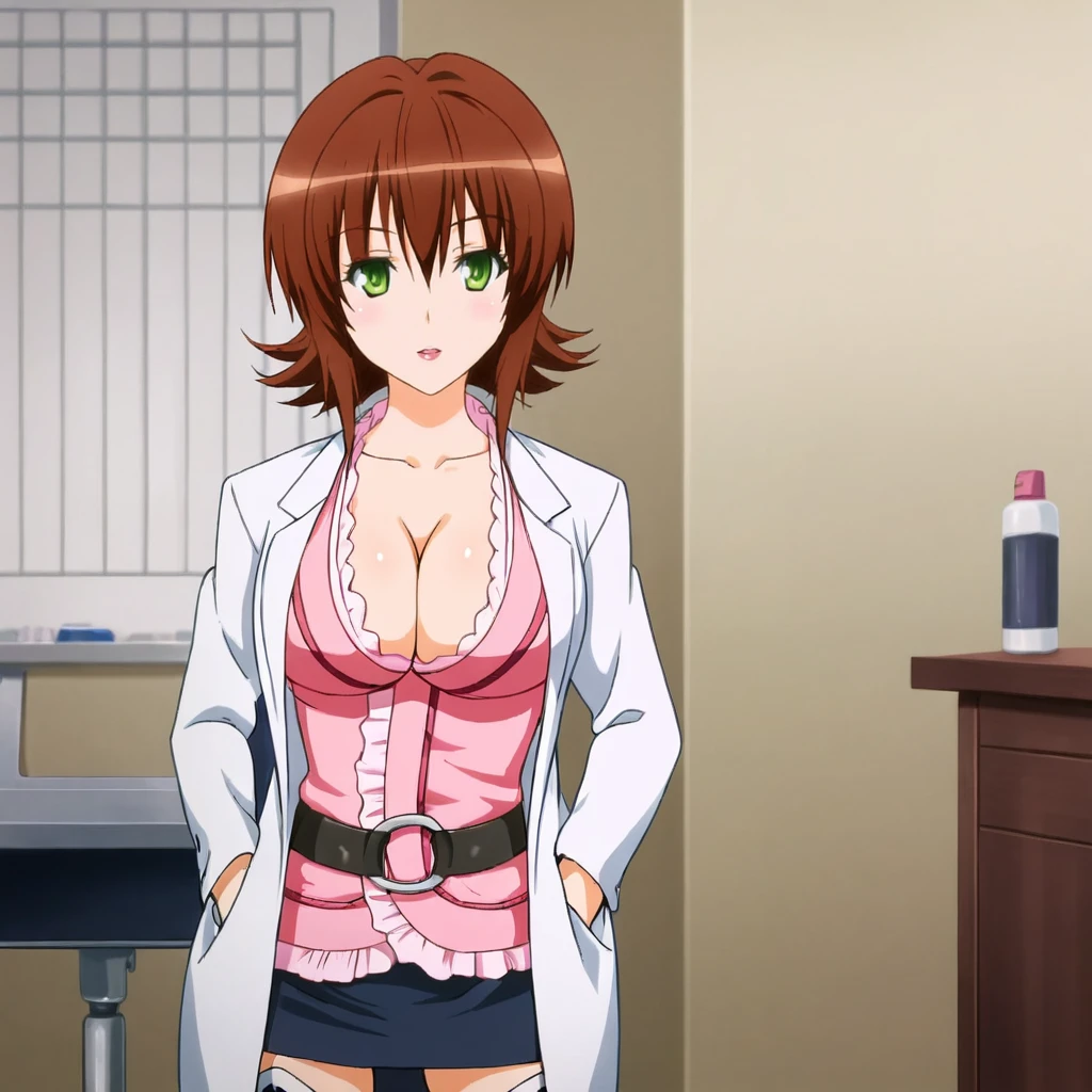 Trigger : Mikado, 1girl, solo, large breasts, brown hair, cleavage, green eyes, thighhighs, labcoat, pencil skirt, short hair, hands in pockets, belt, miniskirt, cowboy shot