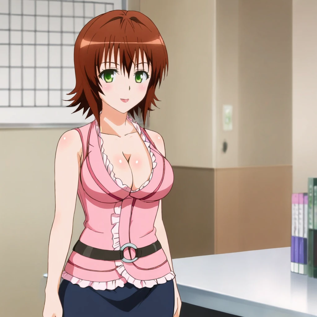 Trigger with no coat: MikadoNoCoat, large breasts, 1girl, cleavage, green eyes, pencil skirt, short hair, brown hair, pink shirt, sleeveless shirt, cowboy shot