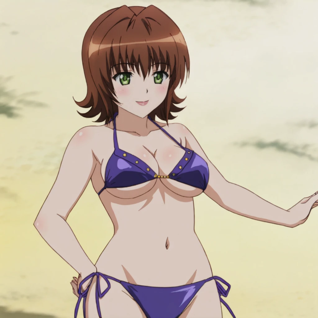 Trigger with bikini: MikadoBikini, 1girl, swimsuit, side-tie bikini bottom, brown hair, green eyes, medium breasts, short hair, navel, purple bikini, underboob, cleavage, cowboy shot