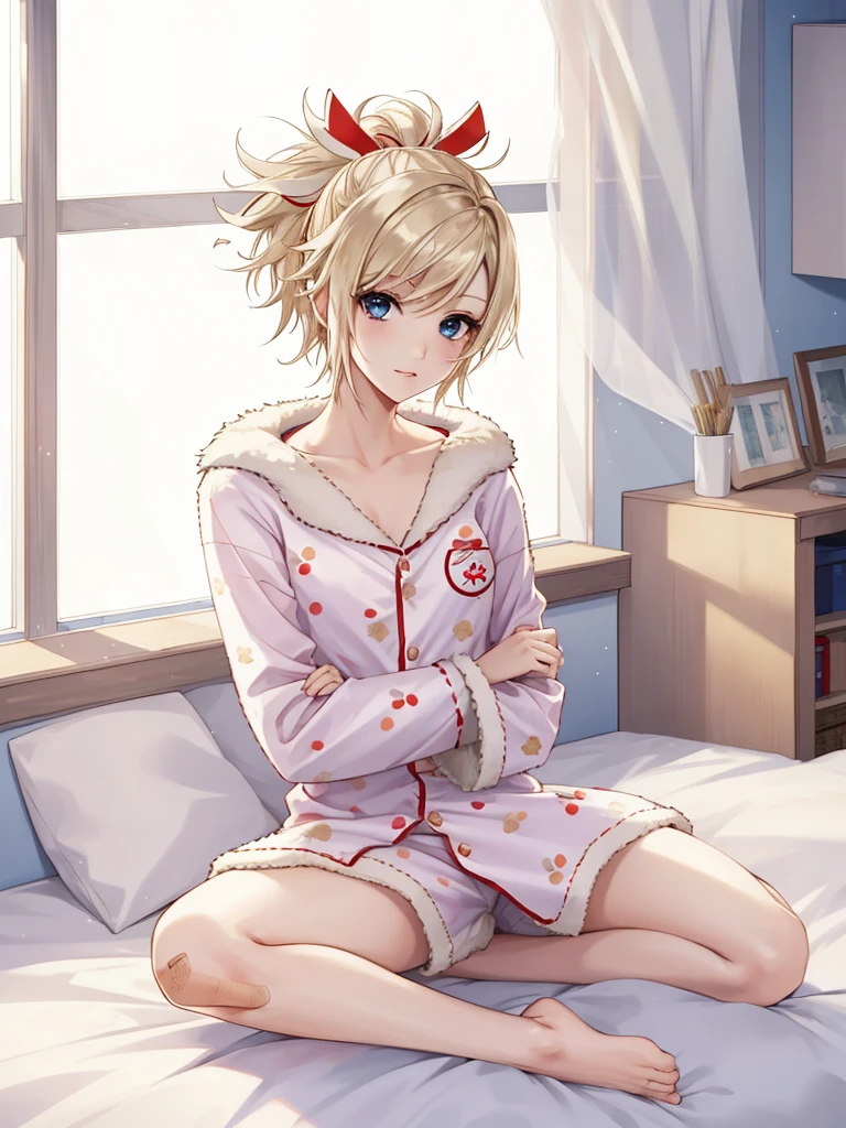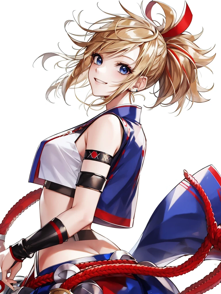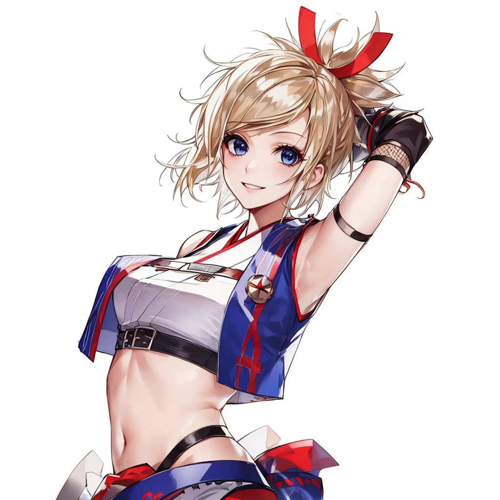 matoi_compass, solo, 1girl, blonde hair, short hair, spiked hair, blue eyes, red hair ribbon, band-aid on cheek, smile, blue hakama shirt, white crop top, black detached sleeves, fishnet, red rope, wooden bells