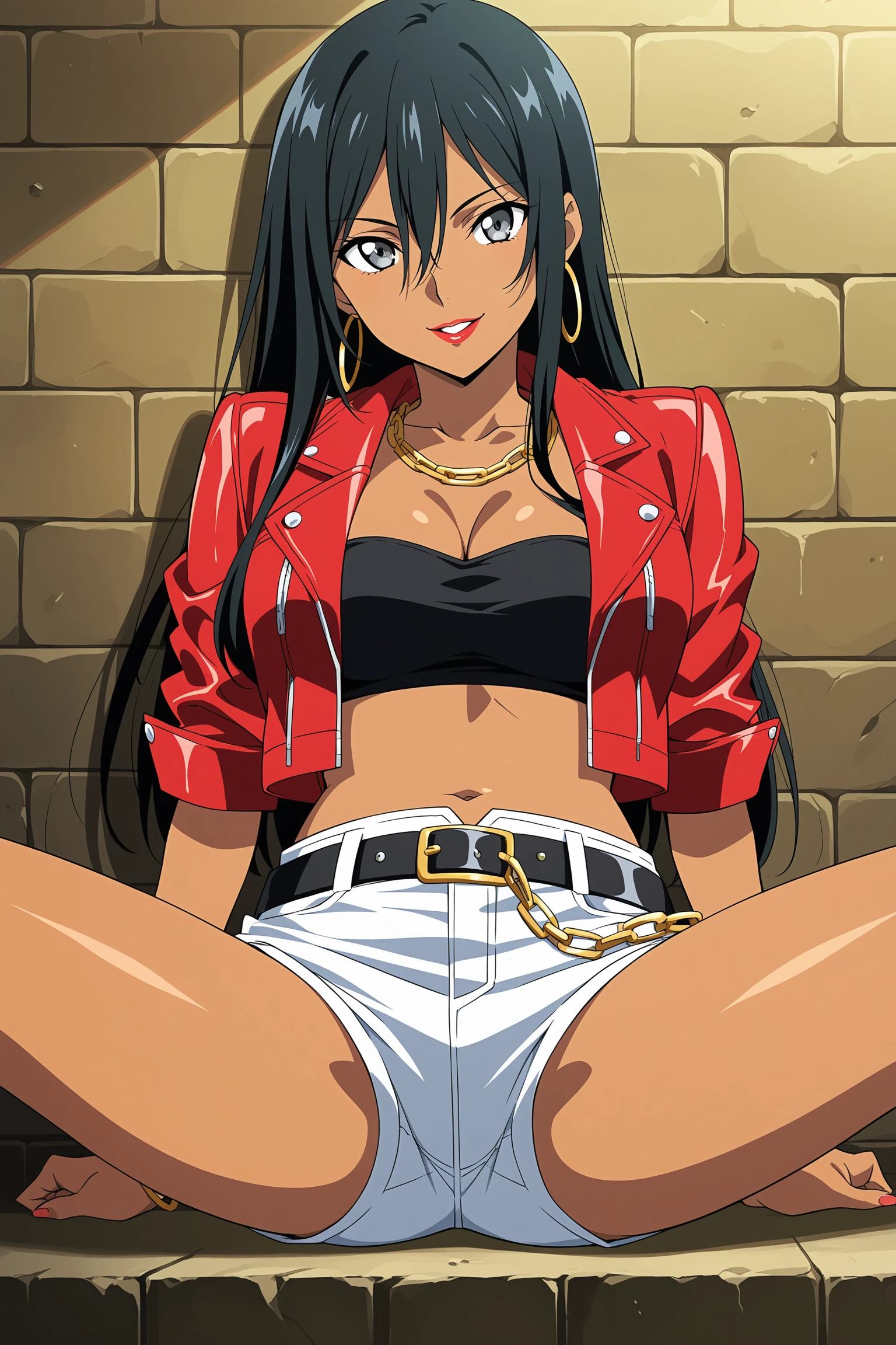 1girl, solo, dark-skinned female, black hair, long hair, grey eyes, breasts | red jacket, jewelry, cleavage, bracelet, lipstick, white shorts, navel, belt, black tube top, chain, jacket, short shorts hair between eyes