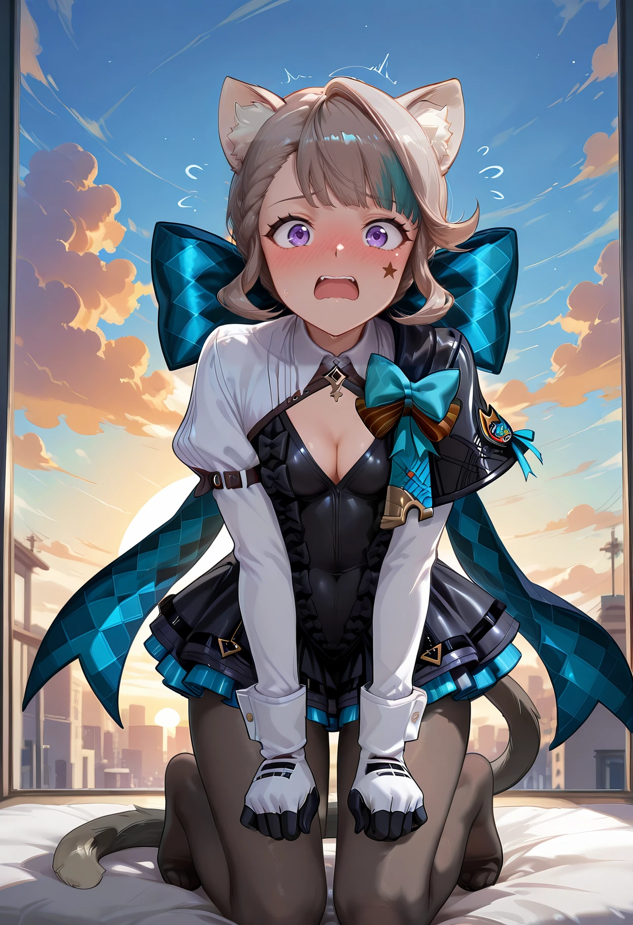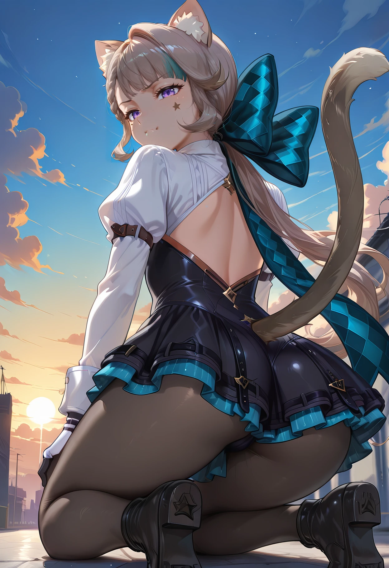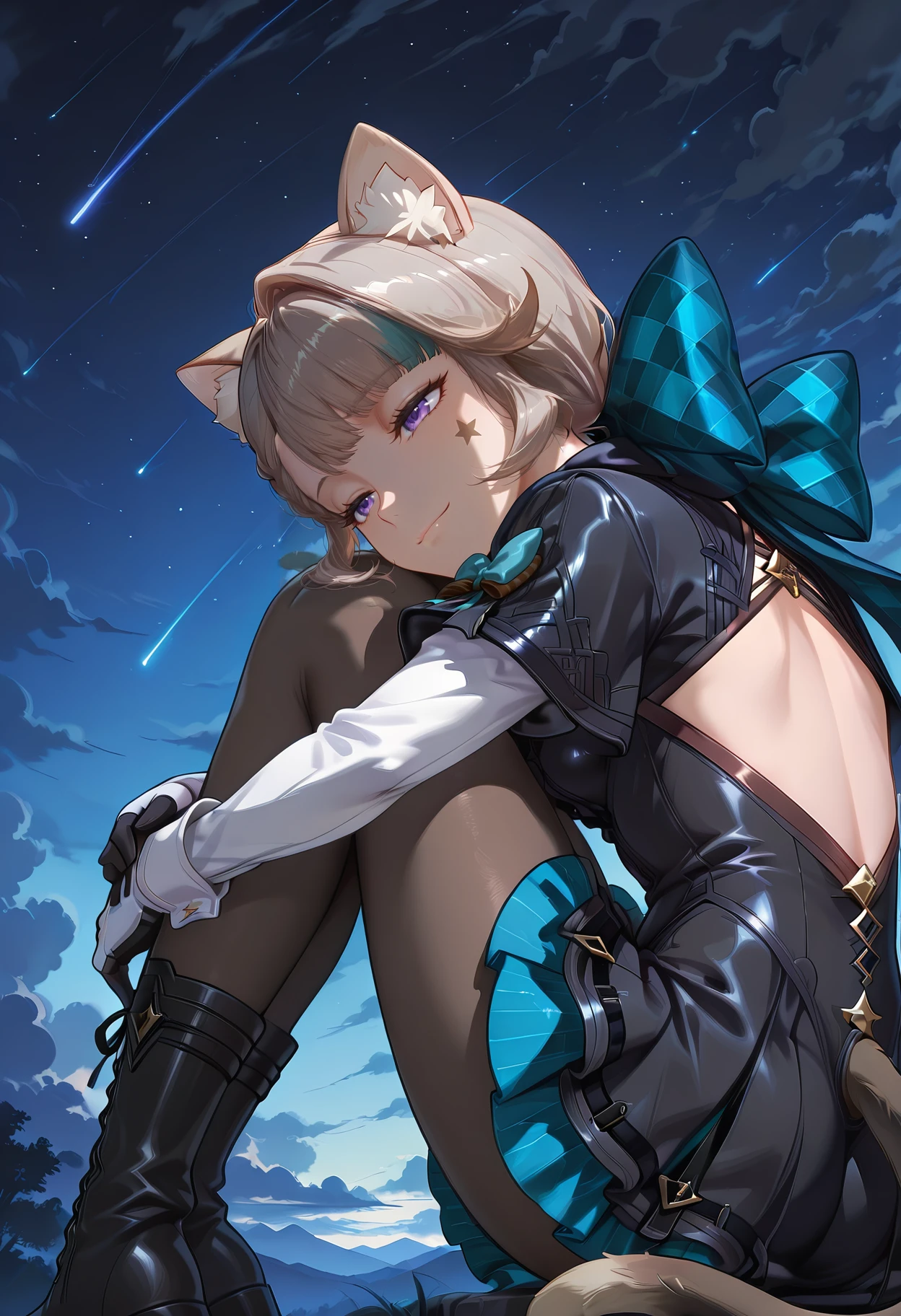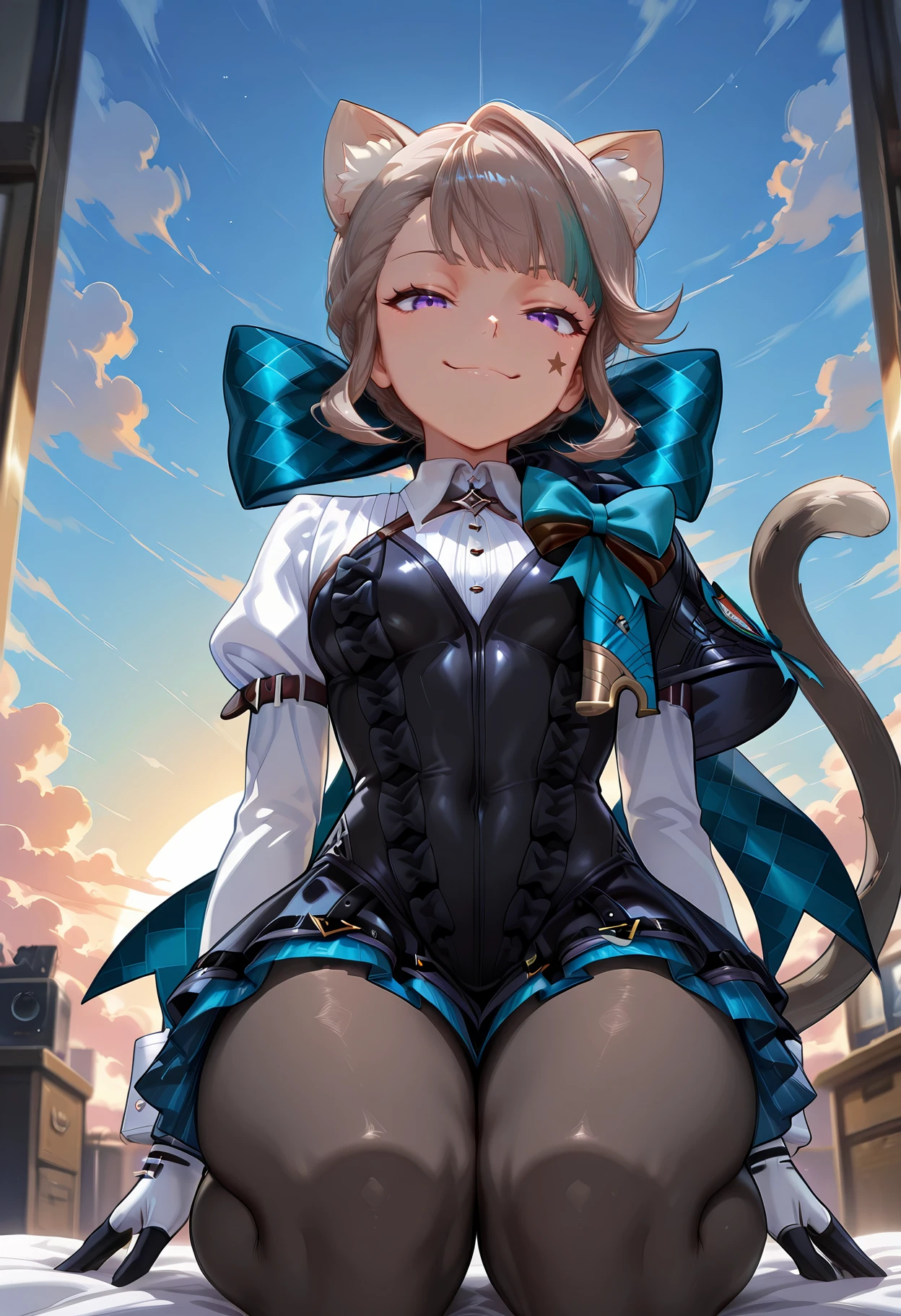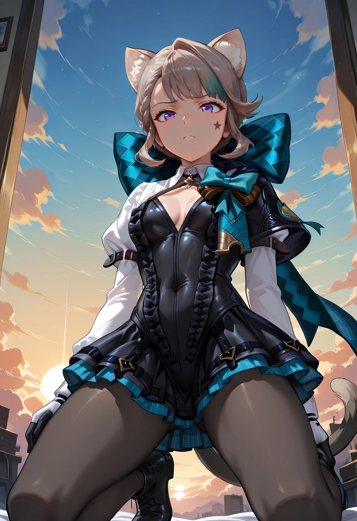 lynette_i94, 1girl, animal ears, purple eyes, animal ear fluff, bow, cat tail, gloves, pantyhose, cat girl, multicolored hair,star \(symbol\) + facial mark,medium skirt, boots,