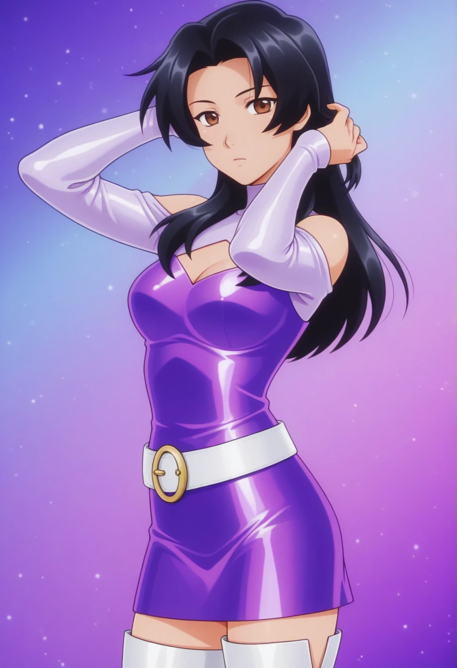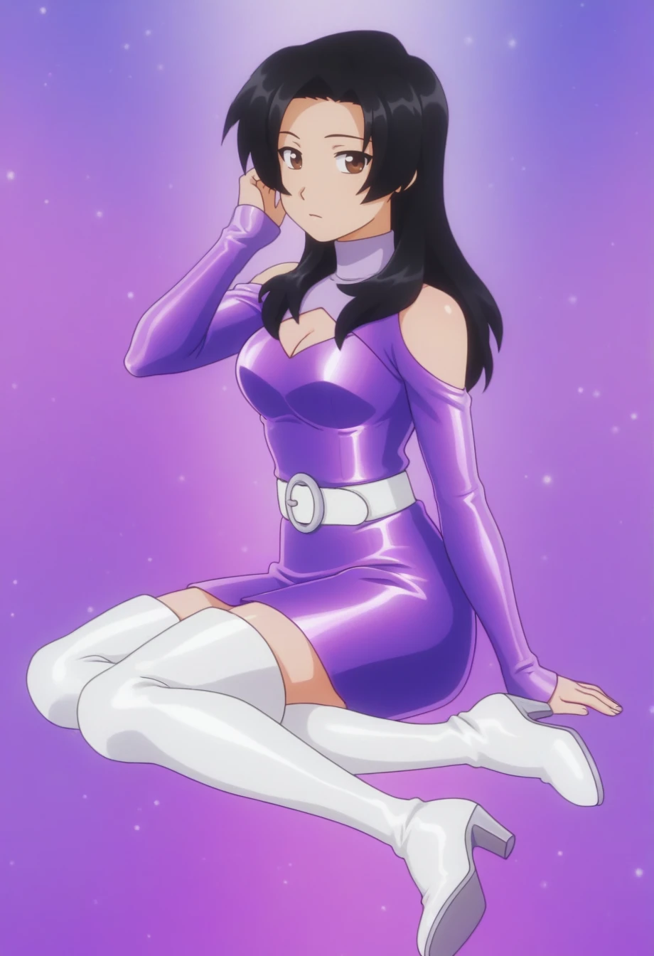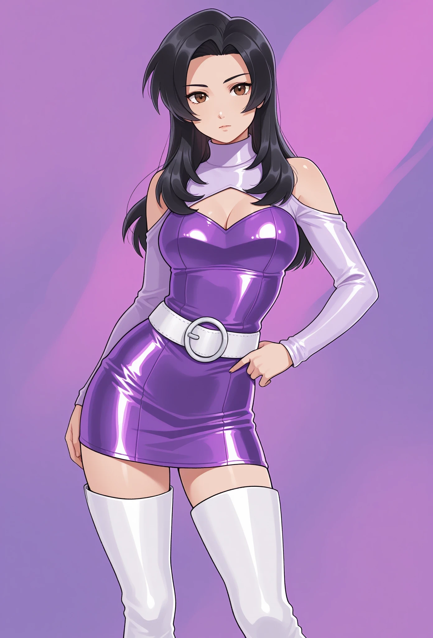annikam, 1girl, solo, black hair, brown eyes, long hair, purple dress, cleavage cutout, shoulder cutout, turtleneck, long sleeves, white belt, white thigh boots, high heels, shiny hair, shiny clothes