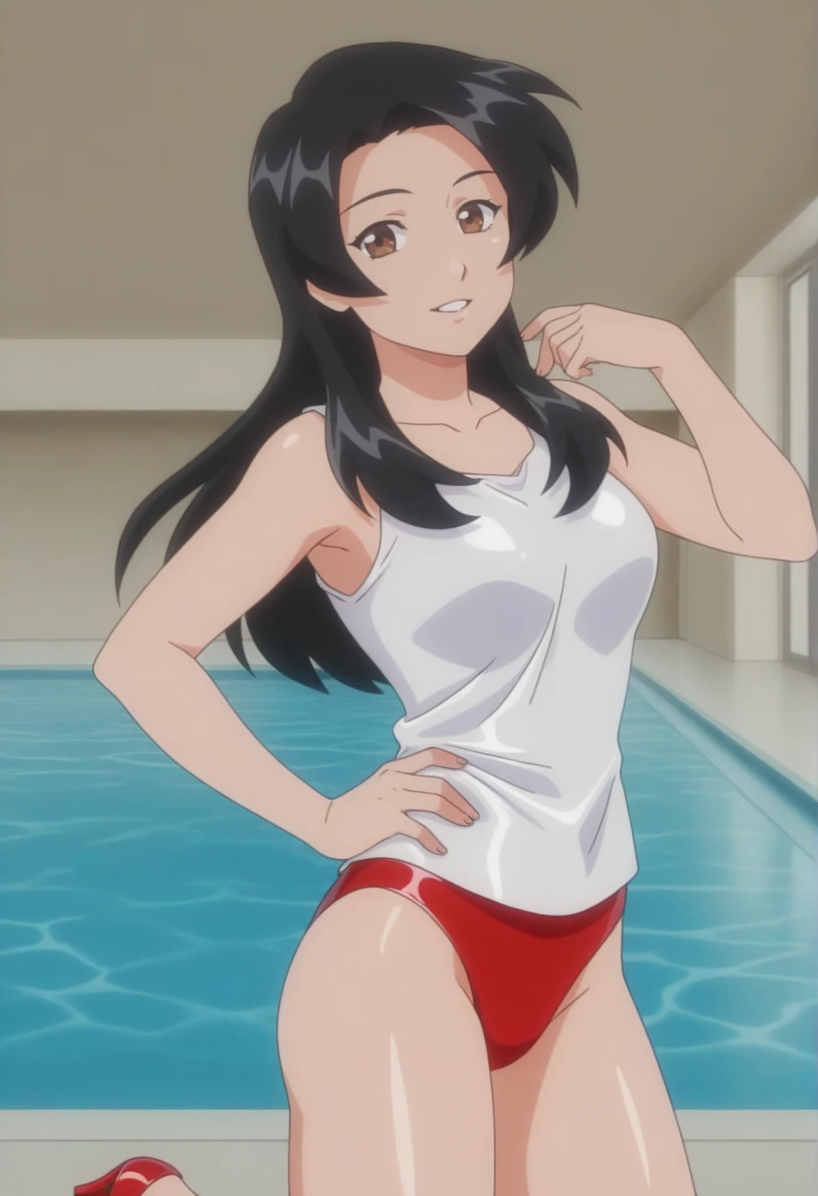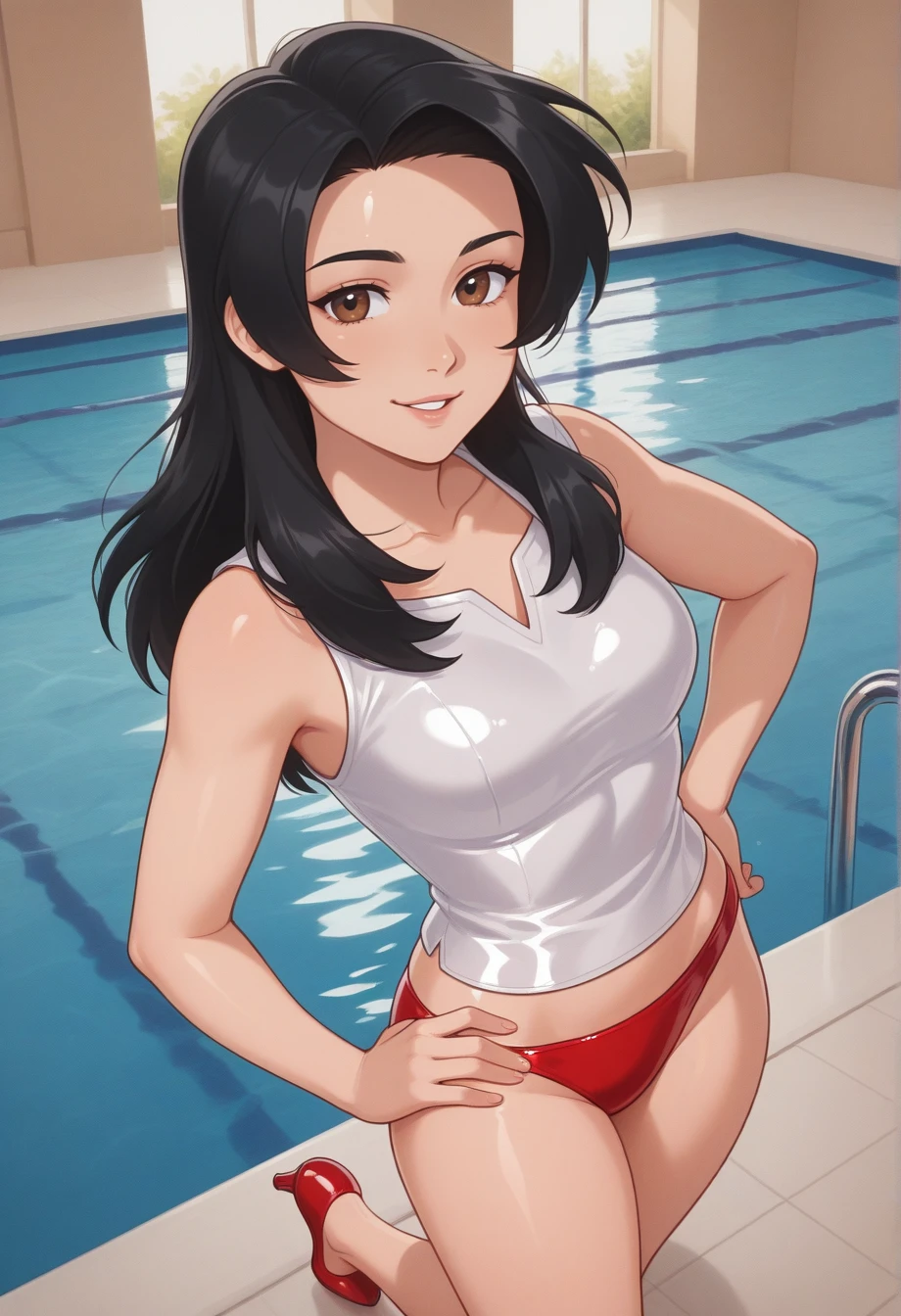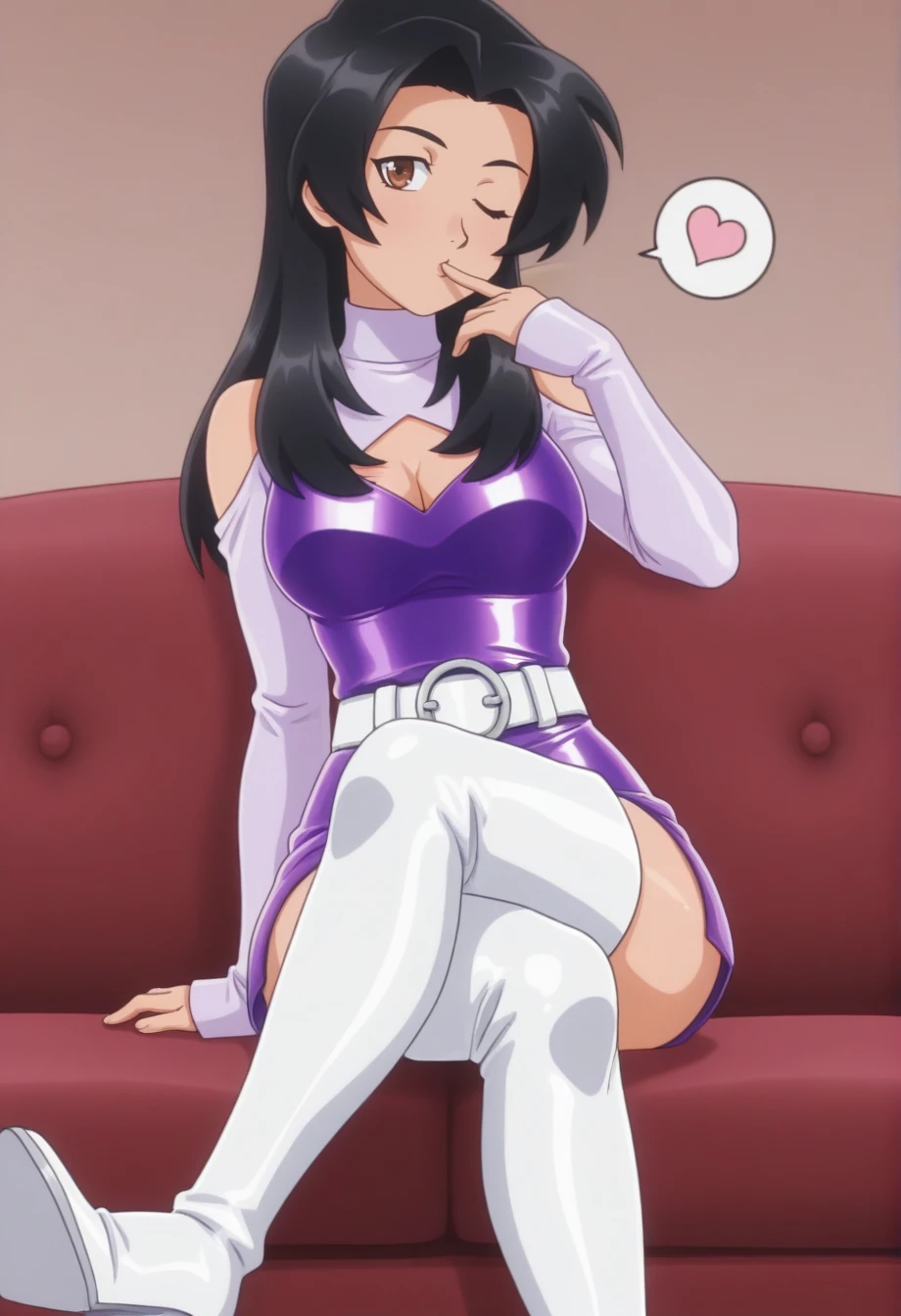 annikam, 1girl, solo, black hair, brown eyes, long hair, purple dress, cleavage cutout, shoulder cutout, turtleneck, long sleeves, white belt, white thigh boots, high heels, shiny hair, shiny clothes