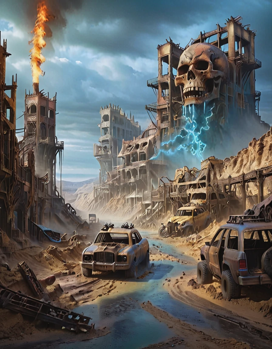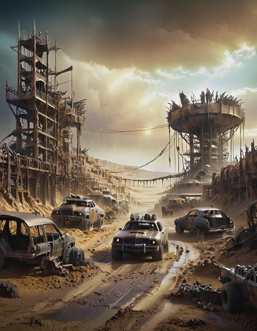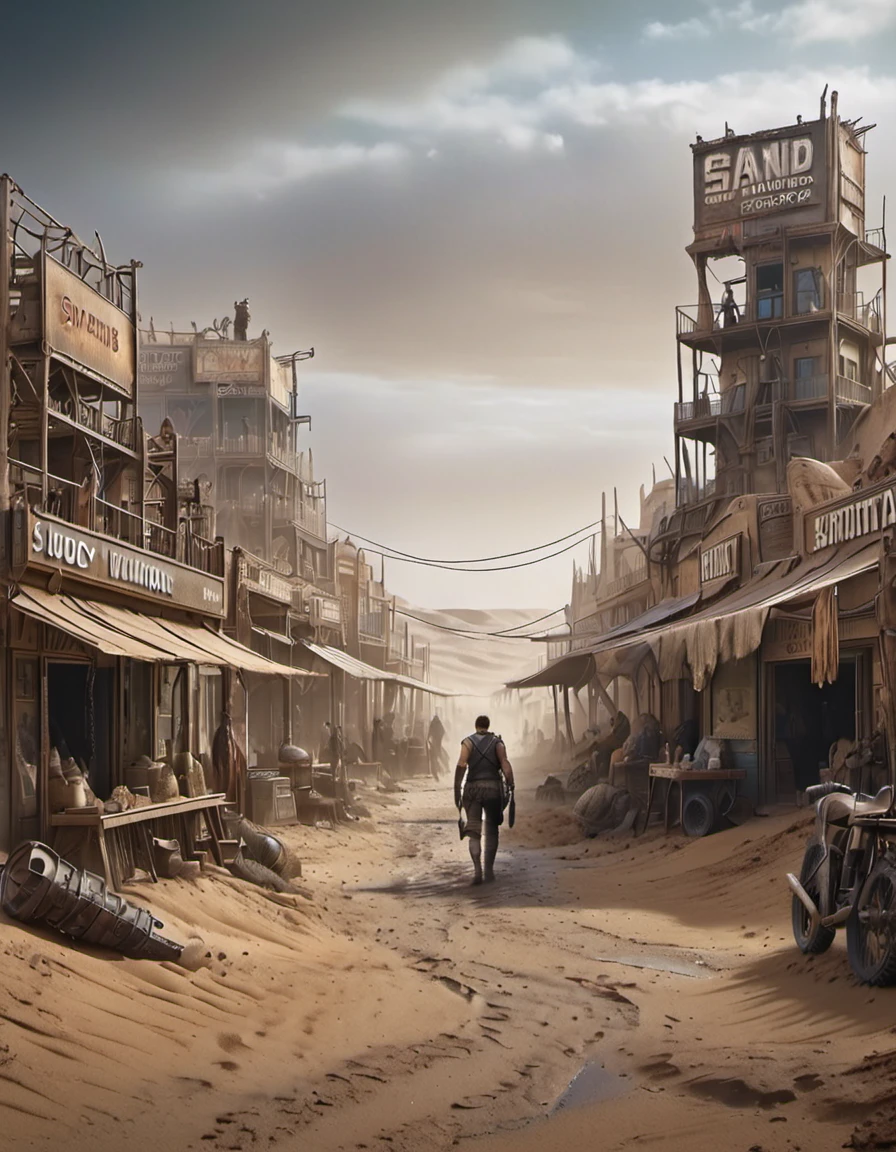 Mad max style cities, houses, shops and vehicules. Sand and mud.