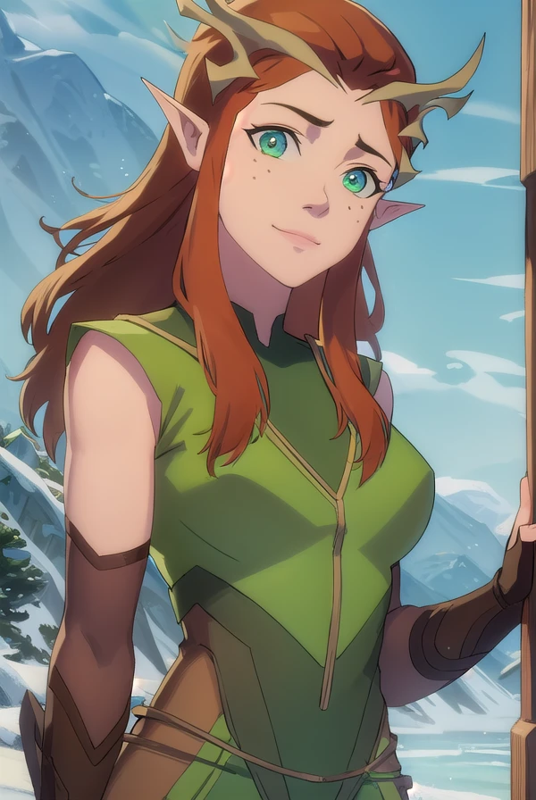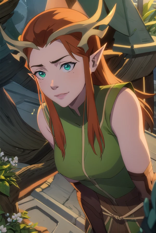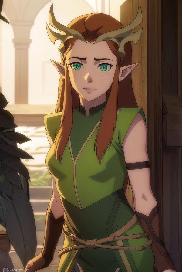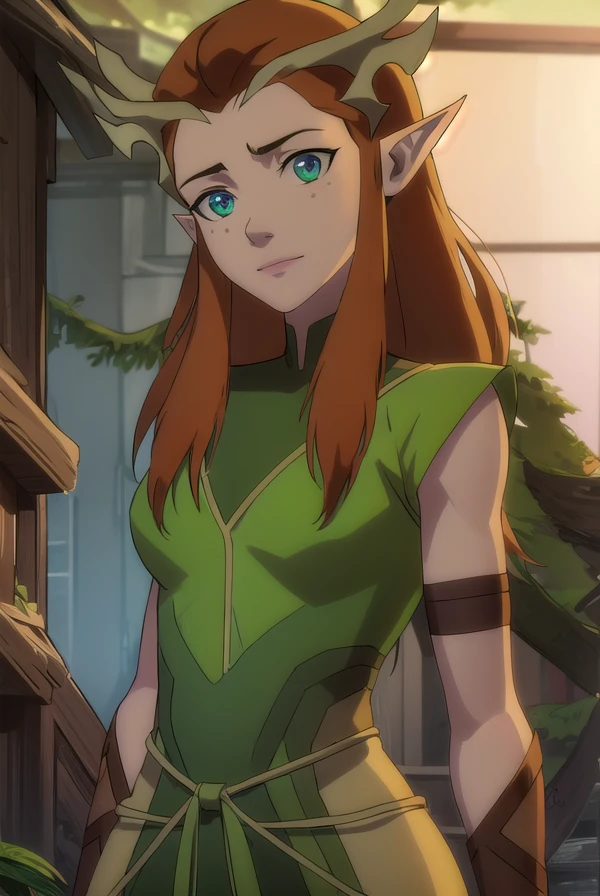 keyleth, long hair, brown hair, (green eyes:1.3), pointy ears, elf, antlers, freckles,