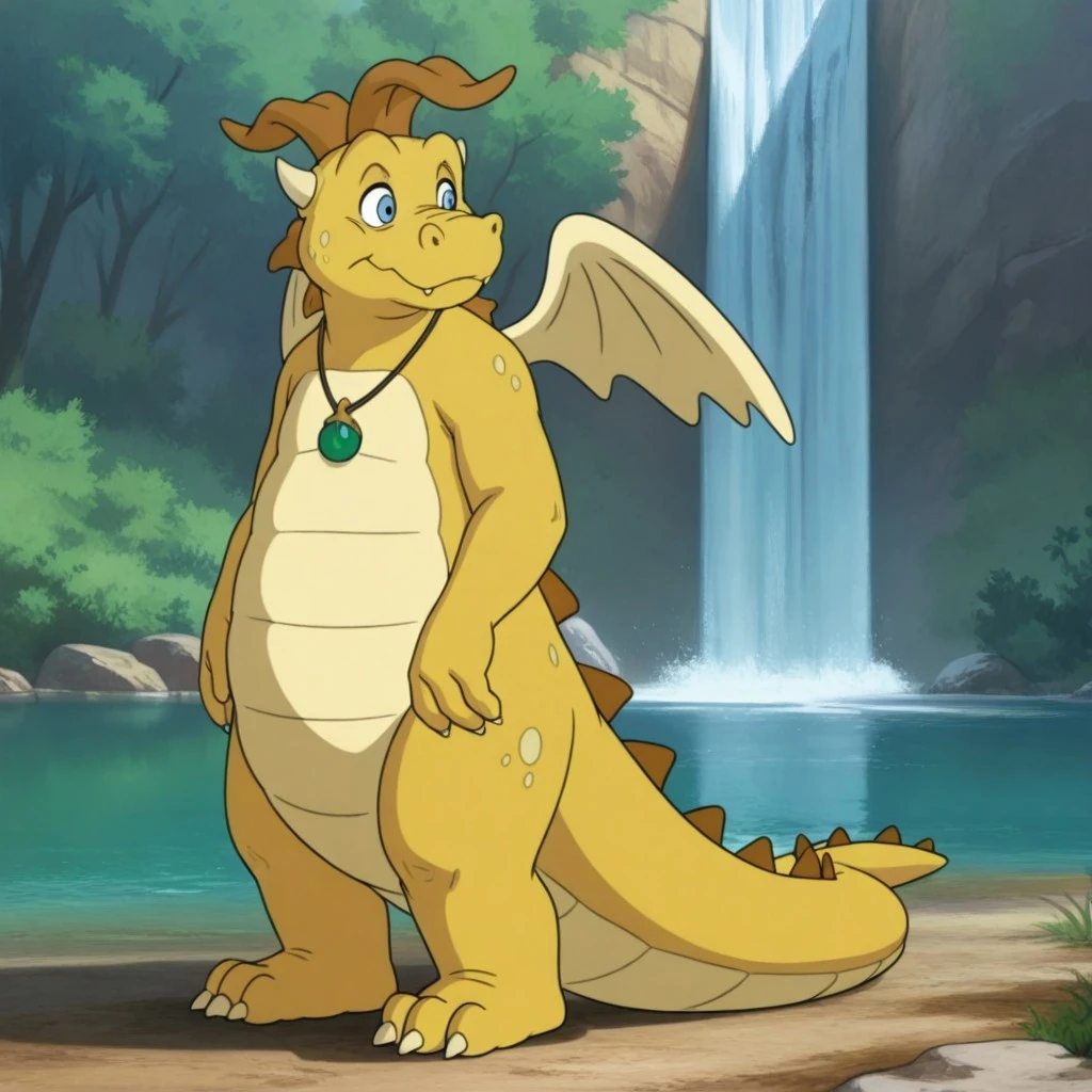 QuetzalDTil, male, semi-anthro, dragon, yellow skin, brown spikes, horns, wings, blue eyes, jewelry, necklace