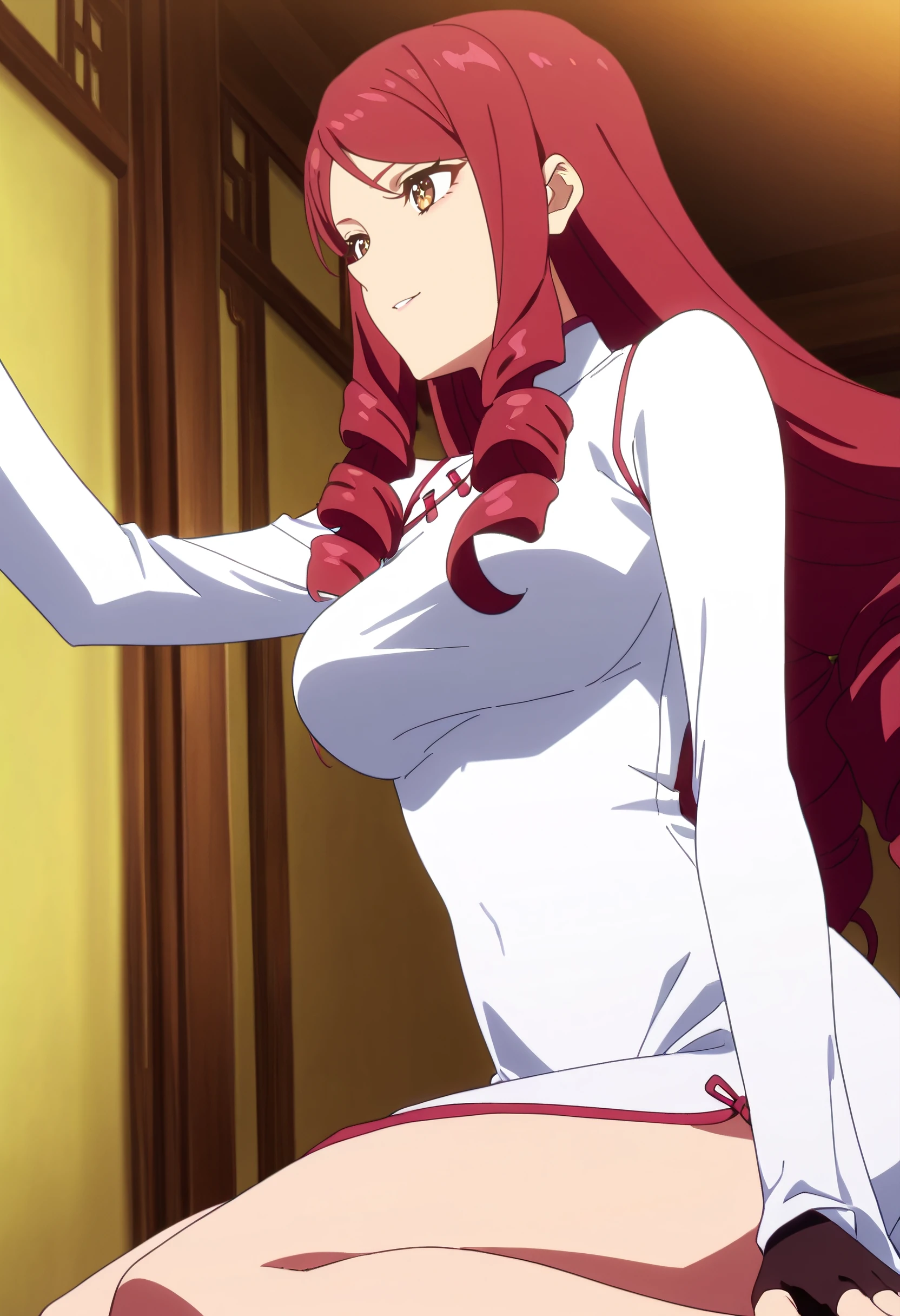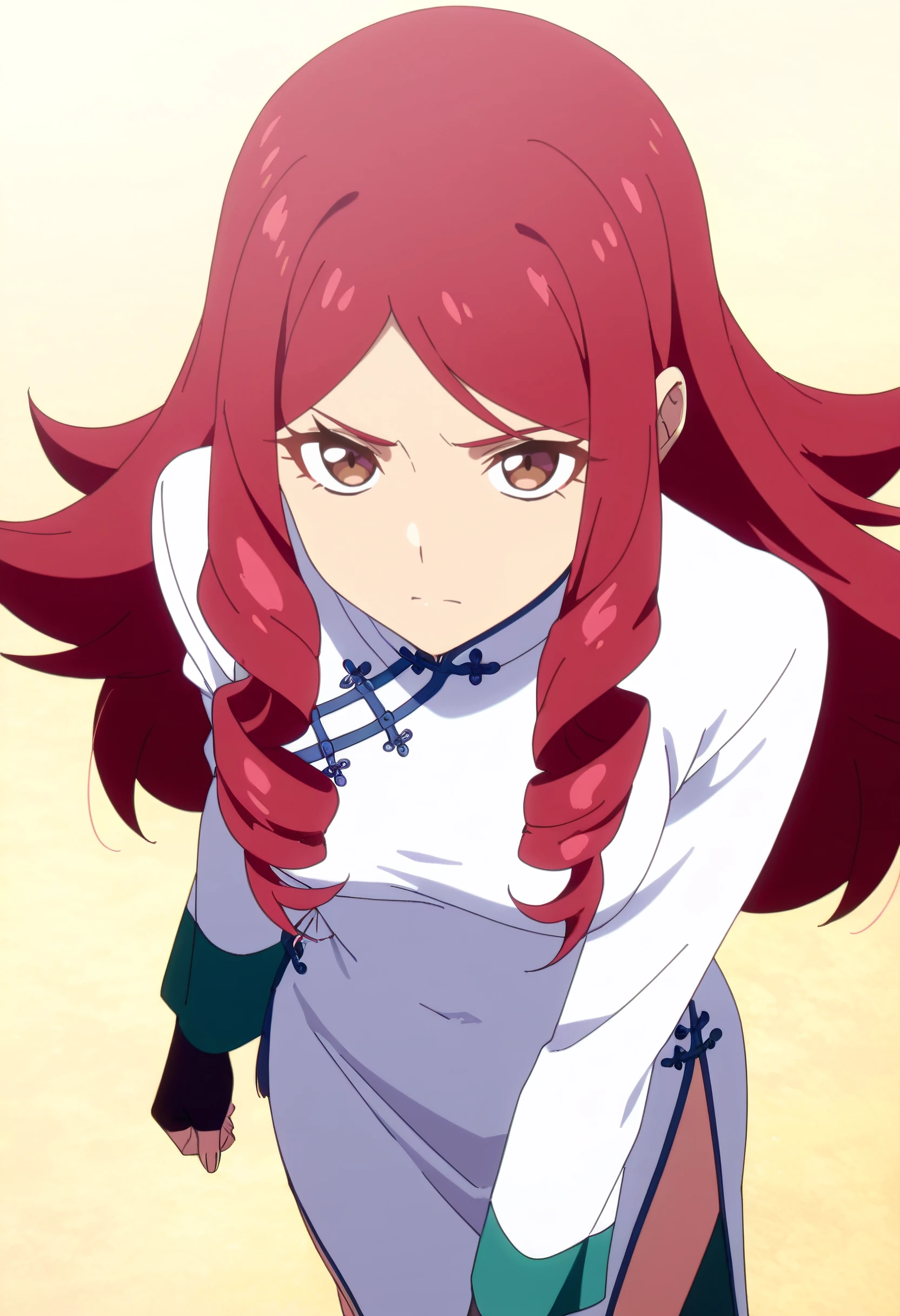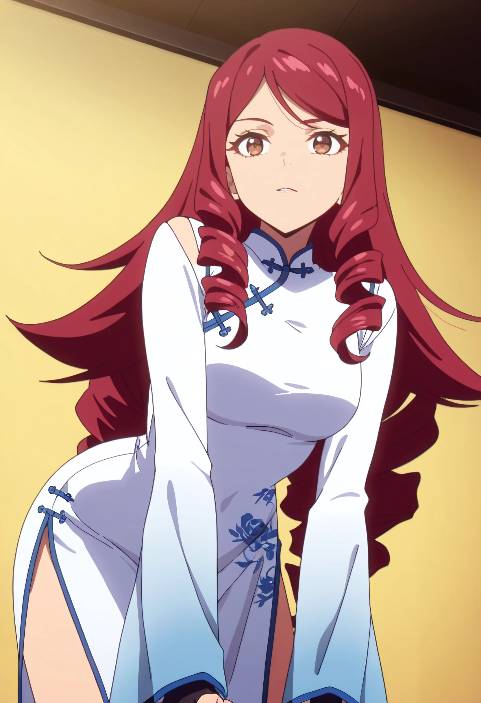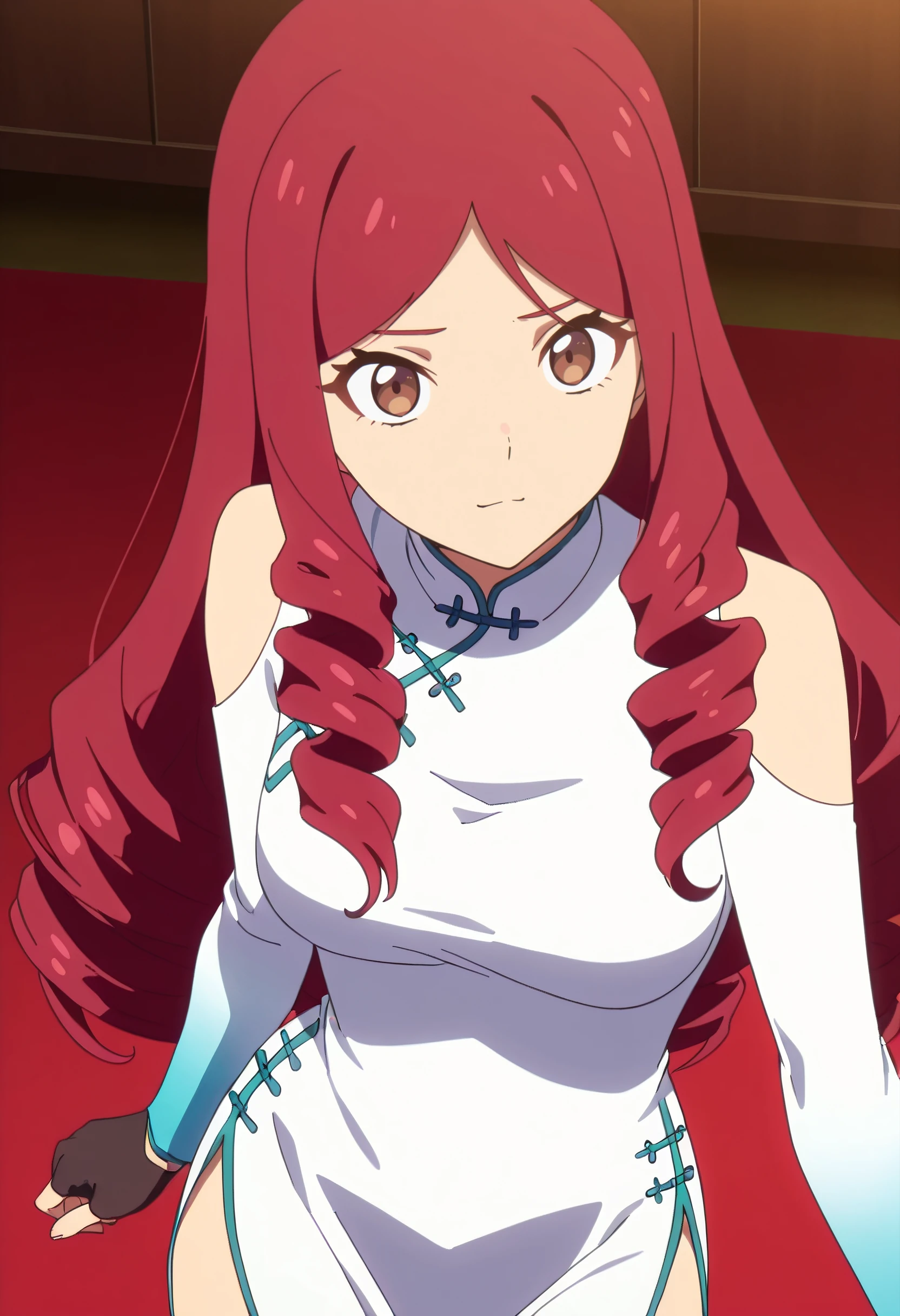 TDLJiangLiuyue, long hair, red hair, brown eyes, bangs, drill hair, hair over shoulder, twin drills,